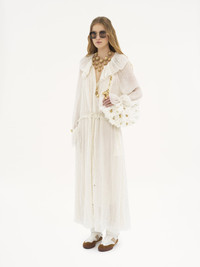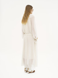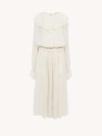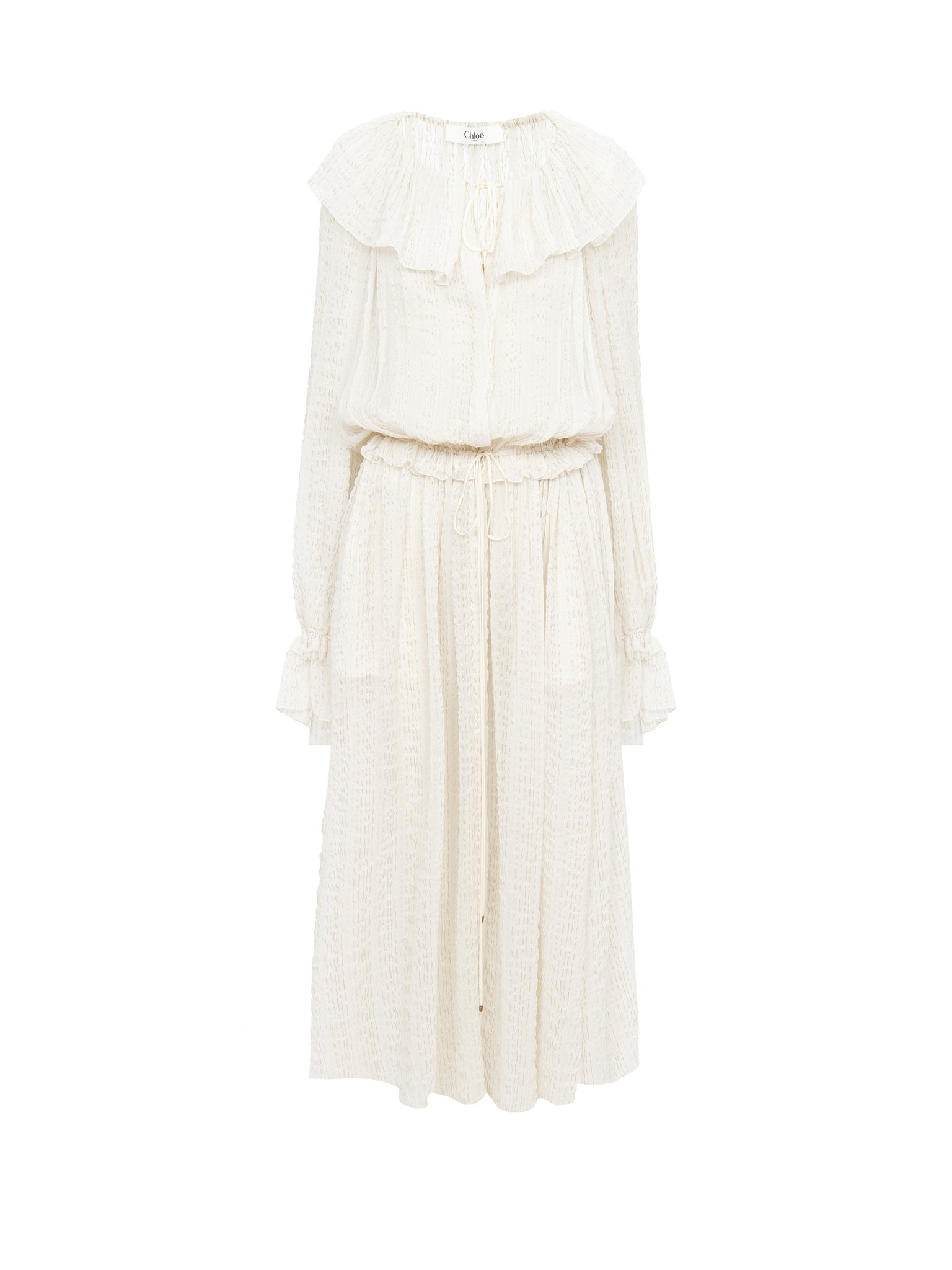 Gathered long dress in textured organic silk crepon with lurex stripes, featuring ruffles, dangling ties with metal tips, and silk-mix lining. PRODUCT DETAILS Gathered long dress outer shell: 77% Silk, 23% Polyester Lining: 68% Acetate fiber, 32% Silk Buttons: 100% Mother-of-pearl Fit: long, fluid - The model is 5'10" (178 cm) and wears a prototype in size 36 - Ruffled long dress - Mother-of-pearl buttons through front - Sphere buttons at cuffs - Drawstring neckline with metal tips - Drawstring waist with metal tips Care: dry cleaning only Organic silk manufacturing restricts the use of pesticides, insecticides or harsh chemicals and incorporates methods that respect biodiversity, improve soil quality and reduce water consumption. This product was made by Marie Helene Couture, a long-standing partner of Chloe based in Morlaas, France. Marie Helene Couture excels in the specialized technique of couture "flou." Their expertise aligns with the rigorous standards set by the "metiers de la mode, vetement flou" certification, ensuring a high level of professional aptitude in this delicate and skilled art form. Color: Whisper White Item code: CH25SRO24296113