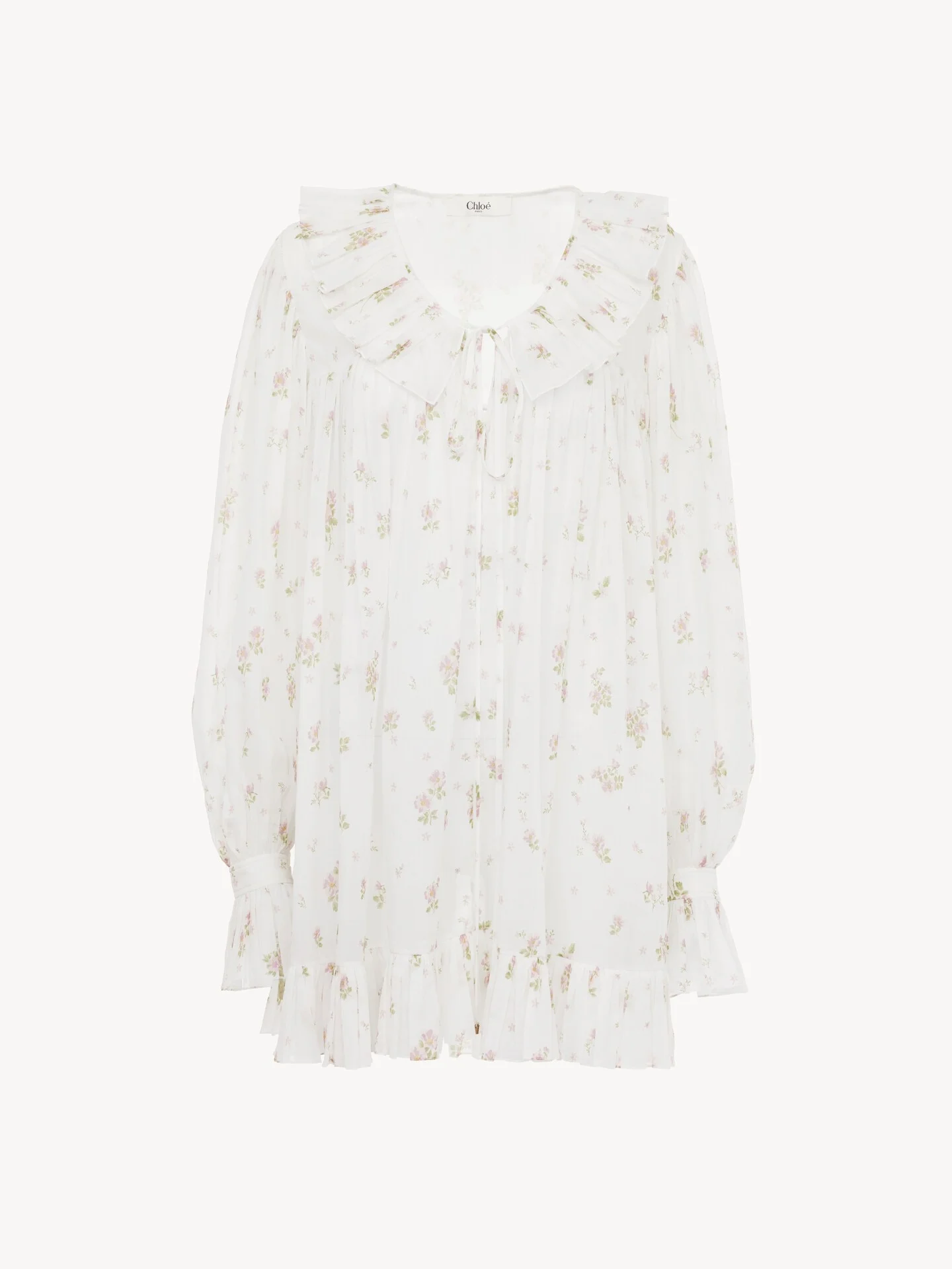 DESCRIPTION Gathered long-sleeve mini dress in cotton voile with a floral Liberty print and a silk-mix lining, featuring ruffle trims at the V-neck collar, cuffs and hem. Dangling ties are finished with gold-tone metal tips. PRODUCT DETAILS Gathered long-sleeve mini dress outer shell: 100% Cotton Lining: 68% Acetate fiber, 32% Silk Buttons: 100% Mother-of-pearl Fit: fluid, mini length - The model is 5'10" (178 cm) and wears a prototype in size 36 - Printed cotton mini dress - Mother-of-pearl buttons at cuffs - Tie fastening at neck with hammered metal tips This product was made in collaboration with Akanjo, a certified WFTO supplier. Akanjo is a social enterprise located in Madagascar that places equal pay and employees' health & wellbeing at the core of their priorities. A long-standing partner of Chloe for 15 years, Akanjo is also committed to training and promoting craftsmanship. Color: Iconic Milk Item code: CH25ARO26896107 CARE INSTRUCTIONS To preserve the integrity of your garment, please refrain from washing, entrusting its care to professional cleaning services for optimal maintenance. This garment cannot withstand any bleaching agent. To maintain its shape, gently iron this garment at a maximum sole plate temperature of 110°C, taking care to avoid any harsh pressure while ironing. Entrust this garment to a specialist for mild cleaning with tetrachloroethylene and solvent F, ensuring its delicate nature is maintained with the most care. To maintain its delicate nature, do not wet clean this garment. To best preserve its form and texture, please do not tumble dry this garment. TRACEABILITY Better traceability is central to improving our materials as well as social and environmental practices. Dyeing: Italy Finishing: Italy Weaving: China