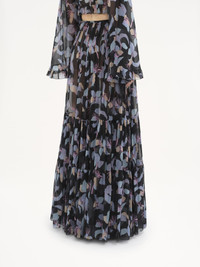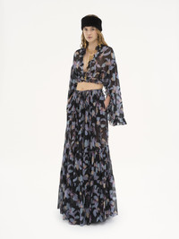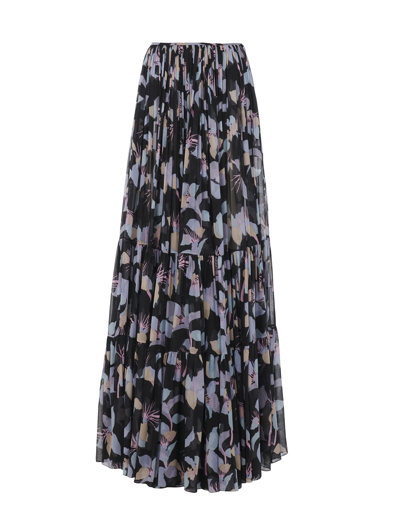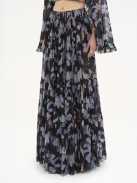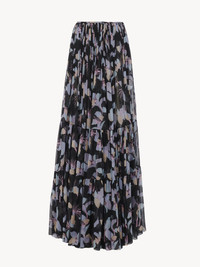 Gathered maxi skirt in organic silk georgette with a floral print rooted in the Maison's heritage and a separate skirt lining. PRODUCT DETAILS Gathered maxi skirt outer shell: 100% Silk Separate lining: 68% Acetate fiber, 32% Silk Fit: fluid, maxi length - The model is 5'10" (178 cm) and wears a prototype in size 36 - Long printed silk skirt - Hook & zipper fastening - Separate lining Care: dry cleaning only Organic silk manufacturing restricts the use of pesticides, insecticides or harsh chemicals and incorporates methods that respect biodiversity, improve soil quality and reduce water consumption. This product was made in collaboration with Akanjo, a certified WFTO supplier. Akanjo is a social enterprise located in Madagascar that places equal pay and employees' health & wellbeing at the core of their priorities. A long-standing partner of Chloe for 15 years, Akanjo is also committed to training and promoting craftsmanship. Color: Black Item code: CH25SJU50343001