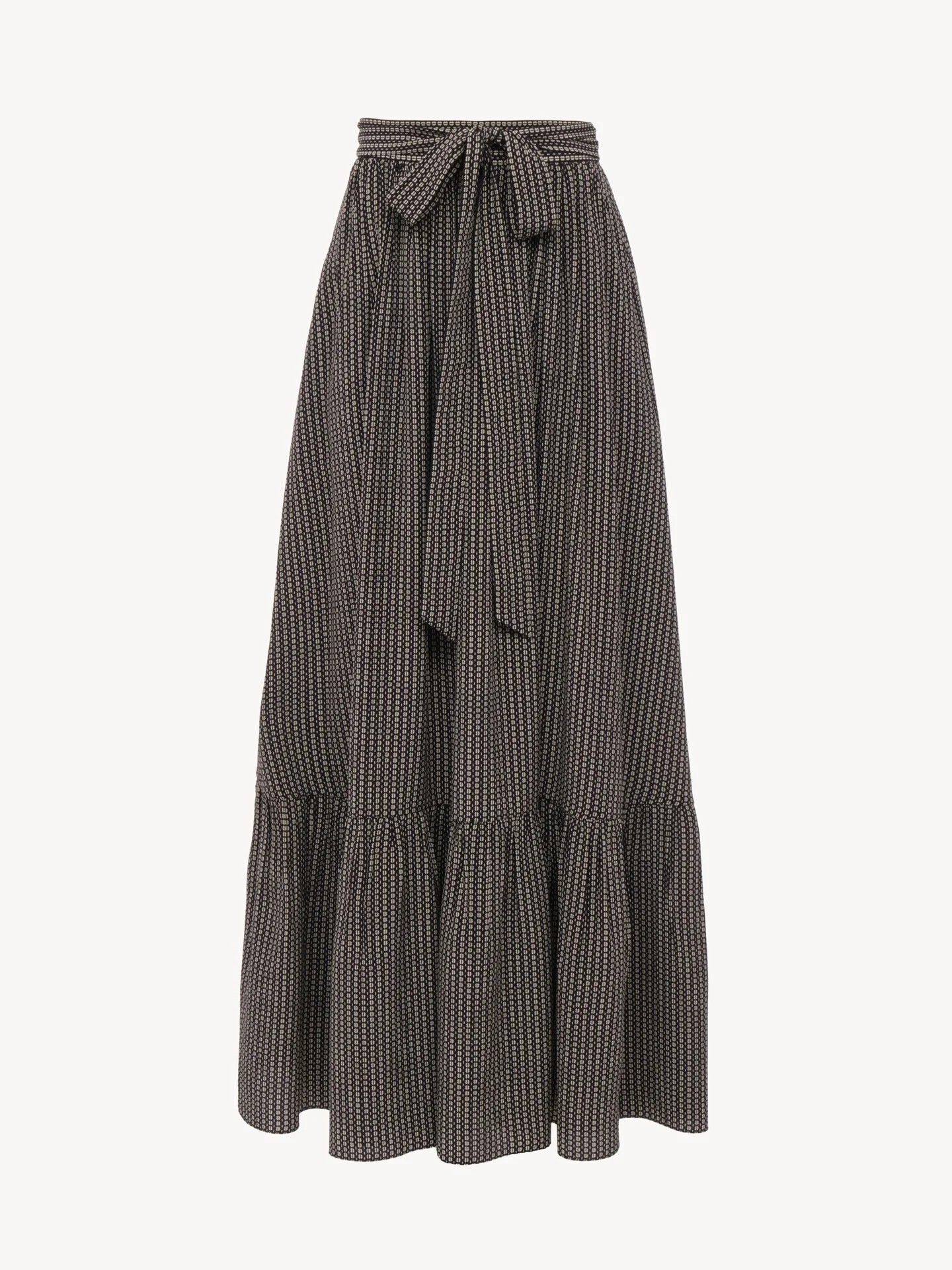 DESCRIPTION Gathered midi skirt in organic silk crepe de chine with a graphic print. The fluid, tiered silhouette features a self-fabric belt knotted at the waist. PRODUCT DETAILS Gathered midi skirt outer shell: 100% Silk Fit: fluid, midi length - The model is 5'10" (178 cm) and wears a prototype in size 36 - Printed silk skirt - Invisible side zipper - Self-fabric belt knotted at front Organic silk manufacturing restricts the use of pesticides, insecticides or harsh chemicals and incorporates methods that respect biodiversity, improve soil quality and reduce water consumption. This product was made in collaboration with Akanjo, a certified WFTO supplier. Akanjo is a social enterprise located in Madagascar that places equal pay and employees' health & wellbeing at the core of their priorities. A long-standing partner of Chloe for 15 years, Akanjo is also committed to training and promoting craftsmanship. Color: Black Item code: CH25AJU04145905 CARE INSTRUCTIONS To preserve the integrity of your garment, please refrain from washing, entrusting its care to professional cleaning services for optimal maintenance. This garment cannot withstand any bleaching agent. To maintain its shape, gently iron this garment at a maximum sole plate temperature of 110°C, taking care to avoid any harsh pressure while ironing. Entrust this garment to a specialist for mild cleaning with tetrachloroethylene and solvent F, ensuring its delicate nature is maintained with the most care. To maintain its delicate nature, do not wet clean this garment. To best preserve its form and texture, please do not tumble dry this garment. TRACEABILITY Better traceability is central to improving our materials as well as social and environmental practices. Dyeing: Italy Finishing: Italy Weaving: China Manufacturing : Madagascar