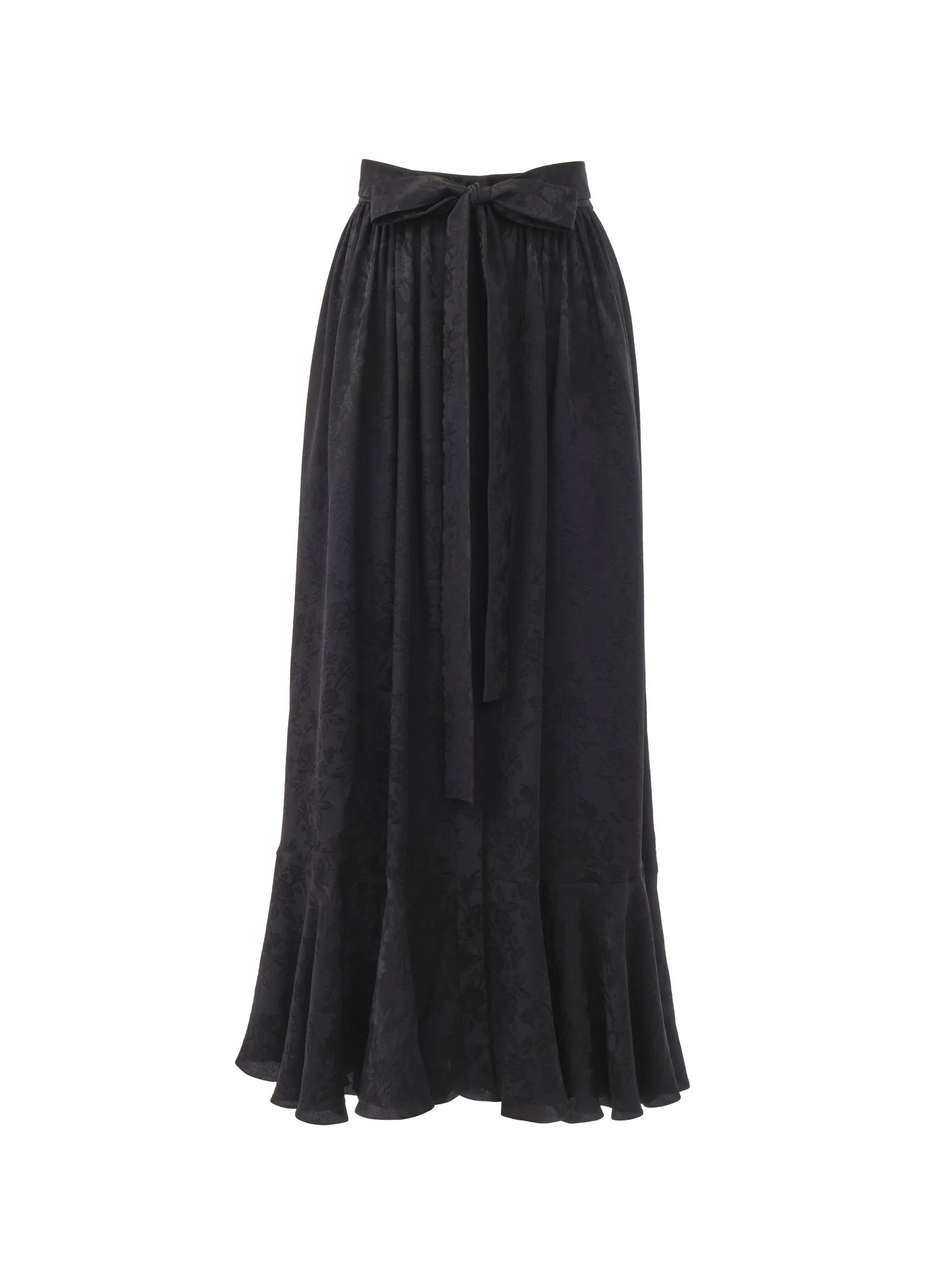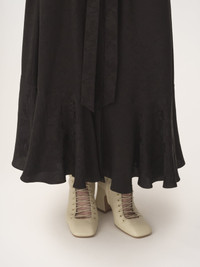 Gathered midi skirt in fluid organic silk with a roses jacquard, featuring a flared hem and mother-of-pearl buttons at the front. A self-fabric belt tied in a bow finishes this piece. PRODUCT DETAILS Gathered midi skirt outer shell: 100% Silk Buttons: 100% Mother-of-pearl Fit: fluid, midi length - The model is 5'10" (178 cm) and wears a prototype in size 33/34 - Silk skirt - Fabric-covered button at waist - Mother-of-pearl buttons through front - Self-fabric belt Organic silk manufacturing restricts the use of pesticides, insecticides or harsh chemicals and incorporates methods that respect biodiversity, improve soil quality and reduce water consumption. This product was made in collaboration with Akanjo, a certified WFTO supplier. Akanjo is a social enterprise located in Madagascar that places equal pay and employees' health & wellbeing at the core of their priorities. A long-standing partner of Chloe for 15 years, Akanjo is also committed to training and promoting craftsmanship. Color: Black Item code: CH25AJU13115001