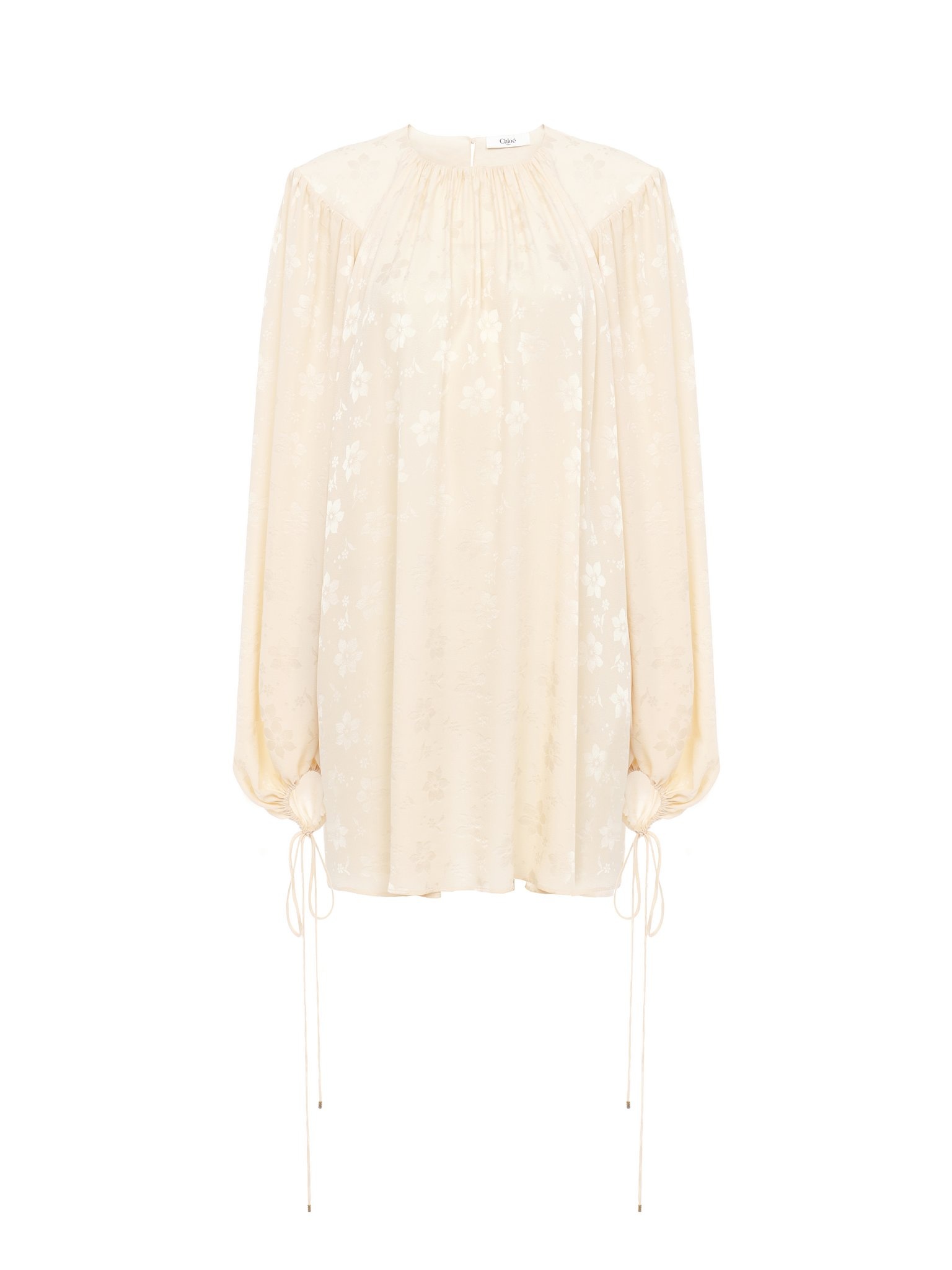 Fluid gathered mini dress in organic silk with a matte and shiny floral jacquard, featuring drawstring cuff ties detailed with gold-toned metal tips. PRODUCT DETAILS Gathered mini dress outer shell: 100% Silk Lining: 76% Acetate fiber, 24% Silk Fit: mini length, fluid - The model is 5'10" (178 cm) and wears a prototype in size 36 - Long-sleeve mini dress - Button at neck - Cuff ties with metal tips Care: dry cleaning only Organic silk manufacturing restricts the use of pesticides, insecticides or harsh chemicals and incorporates methods that respect biodiversity, improve soil quality and reduce water consumption. This product was made in collaboration with Akanjo, a certified WFTO supplier. Akanjo is a social enterprise located in Madagascar that places equal pay and employees' health & wellbeing at the core of their priorities. A long-standing partner of Chloe for 15 years, Akanjo is also committed to training and promoting craftsmanship. Color: Macadamia Brown Item code: CH25SRO14300293
