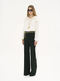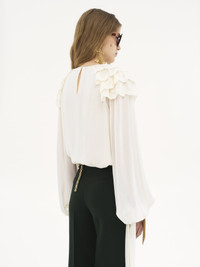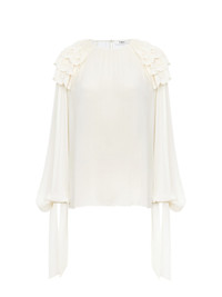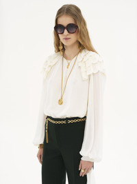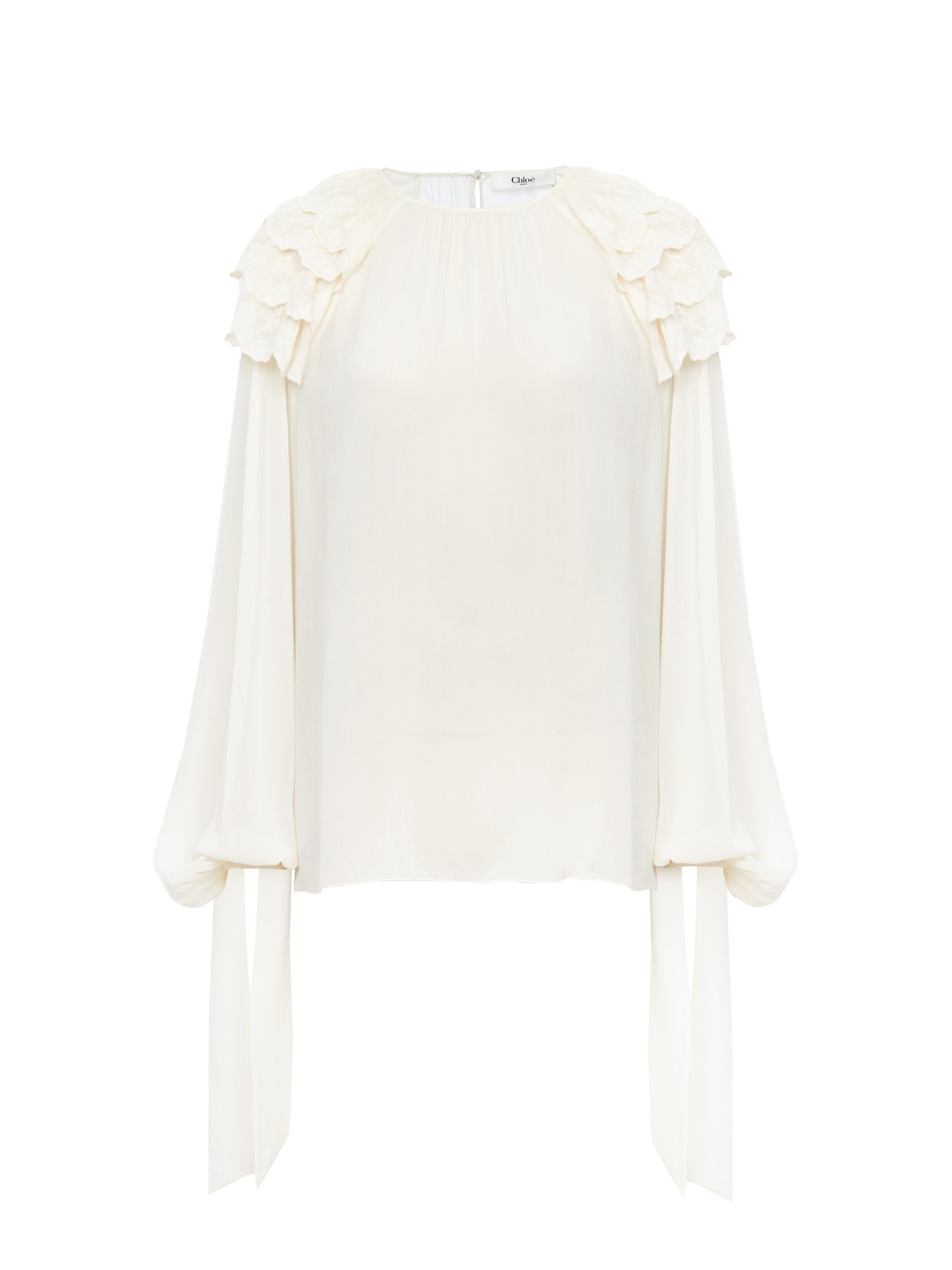 Long-sleeve gathered ruffle top in silk georgette with scalloped floral broderie flounces at the shoulders, long cuff ties and silk-mix lining. PRODUCT DETAILS Gathered ruffle top outer shell: 100% Silk Shoulder flounces: 100% Polyamide Lining: 68% Acetate fiber, 32% Silk Embroidery thread: 100% Polyester Fit: fluid - The model is 5'10" (178 cm) and wears a prototype in size 36 - Embroidered long-sleeve silk top - Fabric-covered buttons - Cuff ties Care: dry cleaning only This product was made in collaboration with Akanjo, a certified WFTO supplier. Akanjo is a social enterprise located in Madagascar that places equal pay and employees' health & wellbeing at the core of their priorities. A long-standing partner of Chloe for 15 years, Akanjo is also committed to training and promoting craftsmanship. Color: Dusty White Item code: CH25SHT44404115
