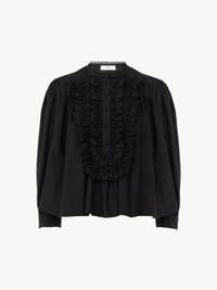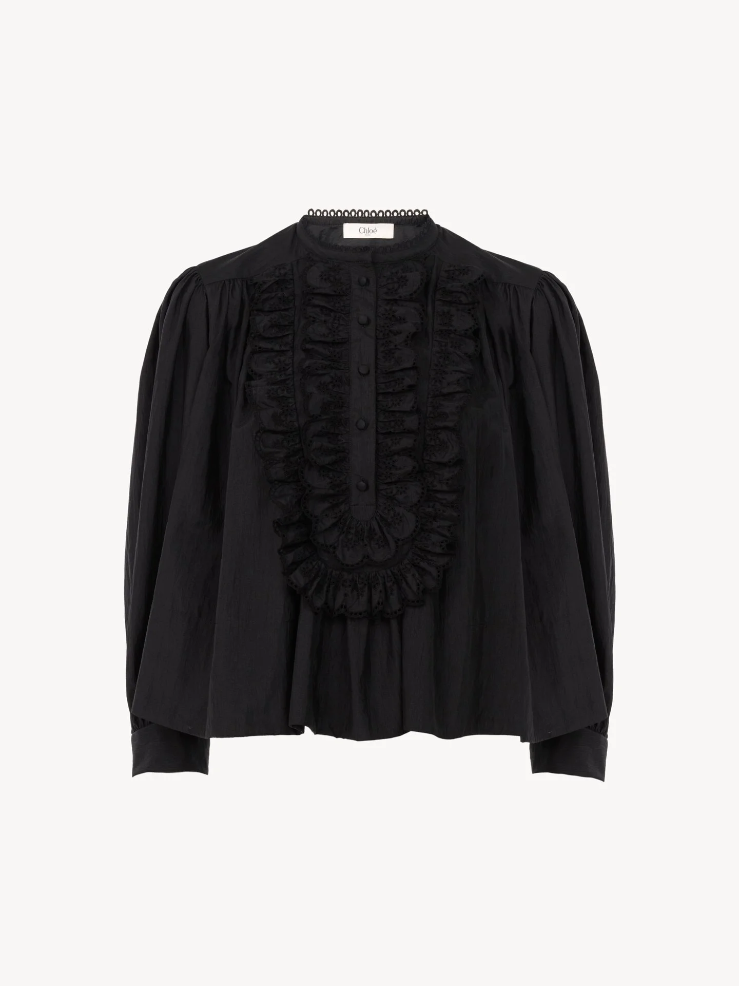 DESCRIPTION Gathered ruffle top in light technical taffeta, featuring an embroidered plastron, fabric-covered buttons and three-quarter sleeves. PRODUCT DETAILS Ruffle top outer shell: 65% Polyamide, 35% Silk Embroidery thread: 80% Cotton, 20% Polyester Fit: fluid - The model is 5'10" (178 cm) and wears a prototype in size 36 - Embroidered top - Fabric-covered buttons at front Color: Black Item code: CH26SHT28102001 CARE INSTRUCTIONS To preserve the integrity of your garment, please refrain from washing, entrusting its care to professional cleaning services for optimal maintenance. This garment cannot withstand any bleaching agent. To maintain its shape, gently iron this garment at a maximum sole plate temperature of 110°C, taking care to avoid any harsh pressure while ironing. Entrust this garment to a specialist for mild cleaning with tetrachloroethylene and solvent F, ensuring its delicate nature is maintained with the most care. To best preserve its form and texture, please do not tumble dry this garment. To maintain its delicate nature, do not wet clean this garment. TRACEABILITY Better traceability is central to improving our materials as well as social and environmental practices. Dyeing: Italy Finishing: Italy Weaving: Italy