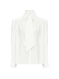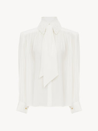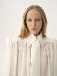 Oversized gathered scarf-tie blouse in organic silk light crepe de chine, featuring a lace-trimmed collar and gold-tone cuff links. PRODUCT DETAILS Scarf-tie blouse outer shell: 100% Silk Shoulder yoke: 76% Acetate fiber, 24% Silk Buttons: 100% Mother-of-pearl Fit: oversized - The model is 5'10" (178 cm) and wears a prototype in size 36 - Gathered silk blouse - Concealed mother-of-pearl buttons through front - Fabric-covered buttons at collar - Gold-tone cuff links - Scarf tie Organic silk manufacturing restricts the use of pesticides, insecticides or harsh chemicals and incorporates methods that respect biodiversity, improve soil quality and reduce water consumption. Color: Iconic Milk Item code: CH25WHT75005107