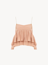 DESCRIPTION Sleeveless ruffle top in iconic organic silk georgette, featuring a tiered silhouette, adjustable thin chain straps with "C" detail, and fabric-covered buttons. PRODUCT DETAILS Sleeveless ruffle top outer shell: 100% Silk Lining: 76% Acetate fiber, 24% Silk Fit: fluid - The model is 5'10" (178 cm) and wears a prototype in size 36 - Sleeveless silk top - Fabric-covered buttons at back Organic silk manufacturing restricts the use of pesticides, insecticides or harsh chemicals and incorporates methods that respect biodiversity, improve soil quality and reduce water consumption. This product was made in collaboration with Akanjo, a certified WFTO supplier. Akanjo is a social enterprise located in Madagascar that places equal pay and employees' health & wellbeing at the core of their priorities. A long-standing partner of Chloe for 15 years, Akanjo is also committed to training and promoting craftsmanship. Color: Biscuit Pink Item code: CH26SHT150026H7 CARE INSTRUCTIONS To preserve the integrity of your garment, please refrain from washing, entrusting its care to professional cleaning services for optimal maintenance. This garment cannot withstand any bleaching agent. To maintain its shape, gently iron this garment at a maximum sole plate temperature of 110°C, taking care to avoid any harsh pressure while ironing. Entrust this garment to a specialist for mild cleaning with tetrachloroethylene and solvent F, ensuring its delicate nature is maintained with the most care. To best preserve its form and texture, please do not tumble dry this garment. To maintain its delicate nature, do not wet clean this garment. TRACEABILITY Better traceability is central to improving our materials as well as social and environmental practices. Dyeing: Italy Finishing: Italy Weaving: Italy
