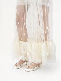 Gathered V-neck long dress in embroidered lace rooted in the Maison's heritage, with a separate dress lining. The ruffle-trim dress features drawstring ties at the waist and cuffs, finished with gold-tone tips. PRODUCT DETAILS V-neck long dress outer shell: 100% Polyester Main lacework: 53% Polyester, 47% Silk Lining: 68% Acetate fiber, 32% Silk Buttons: 100% Mother-of-pearl Fit: fluid, long - The model is 5'10" (178 cm) and wears a prototype in size 36 - Long ruffle dress - Concealed mother-of-pearl button at neckline - Drawstring waist & cuffs with metal tips - Separate lining Care: dry cleaning only This product was made in collaboration with Akanjo, a certified WFTO supplier. Akanjo is a social enterprise located in Madagascar that places equal pay and employees' health & wellbeing at the core of their priorities. A long-standing partner of Chloe for 15 years, Akanjo is also committed to training and promoting craftsmanship. Color: Dusty White Item code: CH25URO46099115