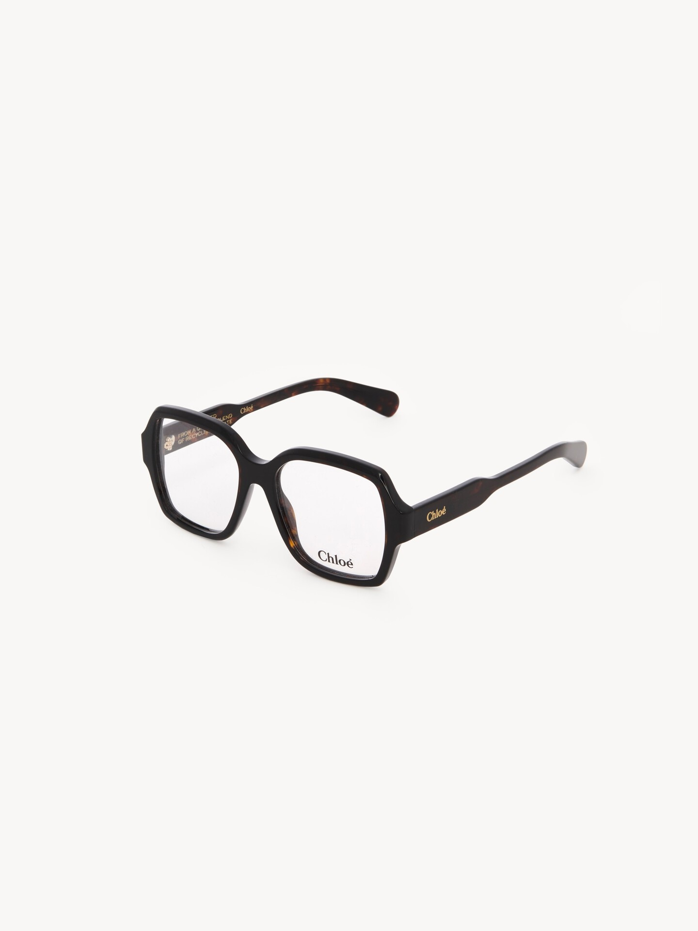 DESCRIPTION A lower-impact style made of pre-consumer recycled acetate, these Gayia round eyeglasses have a lightweight shiny Havana frame with bold temples engraved with the Chloe logo. A first in luxury eyewear, recycled acetate is an innovative material that allows for unique color combinations. An engraved text on the inside of the right temple indicates the model's unique composition. PRODUCT DETAILS Round eyeglasses in recycled acetate - Prescription friendly - Chloe logo engraved on both temples These eyeglasses come with a case and lens cloth - Lens: 2.1" (53 mm) - Bridge: 0.7" (17 mm) - Temple: 5.7" (145 mm) - Dark Havana frame - Transparent lenses Item code: CHC23UEK0155215 CARE INSTRUCTIONS These sunglasses/eyeglasses are made with carefully selected materials. Please handle with care for a longer product life.- Store in the case provided.- Clean with a soft, dry cloth.- If necessary, use a damp cloth and mild detergent. Do not use solvents or aggressive detergents which may alter the features of the sunglasses/eyewear