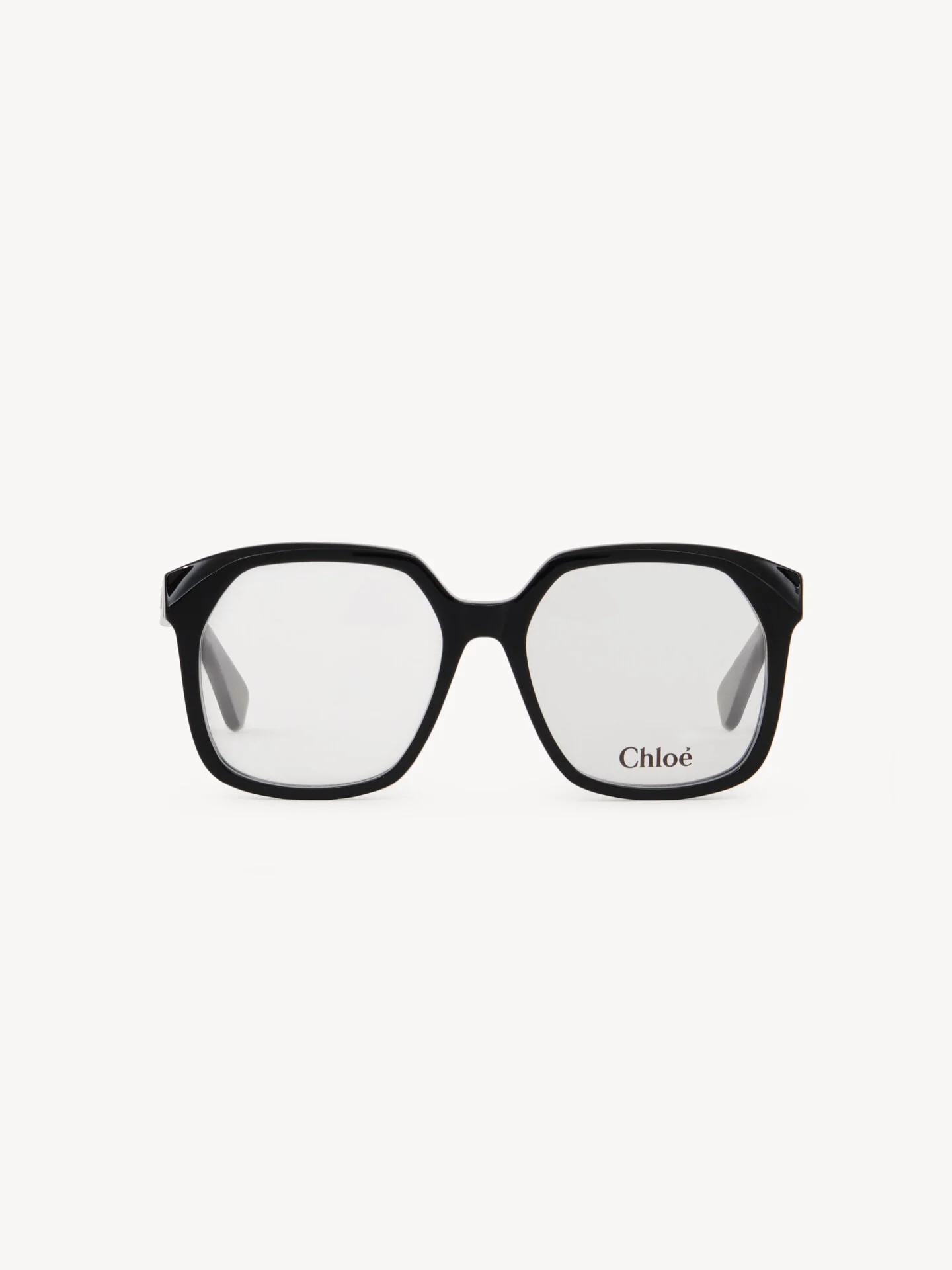 DESCRIPTION Crafted from recycled acetate, these Gayia square eyeglasses have a lightweight shiny black frame with scalloped detail on the bevel. Both temples are engraved with the Chloe logo. A first in luxury eyewear, recycled acetate is an innovative material that allows for unique color combinations. An engraved text on the inside of the right temple indicates the model's unique composition. PRODUCT DETAILS Square eyeglasses in recycled acetate - Prescription friendly - Chloe logo engraved on both temples These Chloe eyeglasses come with a case and lens cloth - Lens: 2.2" (55 mm) - Bridge: 0.7" (17 mm) - Temple: 5.7" (145 mm) These eyeglasses come with transparent sample lenses bearing the Chloe logo to help the frames hold their shape. Please note that they are not intended for use. Visit an opticians or specialized store for a prescription lens fitting instead. - Black recycled acetate frame - Transparent lenses Item code: CH25AEK0263001 CARE INSTRUCTIONS These sunglasses/eyeglasses are made with carefully selected materials. Please handle with care for a longer product life.- Store in the case provided.- Clean with a soft, dry cloth.- If necessary, use a damp cloth and mild detergent. Do not use solvents or aggressive detergents which may alter the features of the sunglasses/eyewear