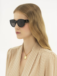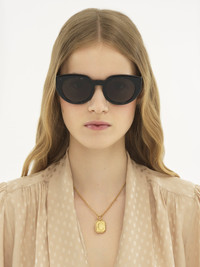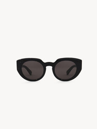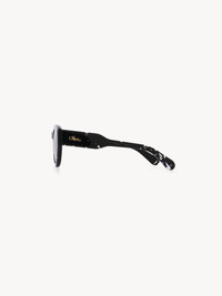 Gayia thick cat-eye sunglasses made of lower-impact pre-consumer recycled acetate and bio-based nylon. Featuring a bold temple shape, the shiny frame is paired with solid gray lenses. A gold-toned Chloe logo signs the left temple. An engraved text on the inside of the right temple indicates the style's unique composition. PRODUCT DETAILS Cat-eye sunglasses in recycled acetate & bio-based nylon - 100% UVA and UVB protection - Not prescription friendly - Chloe logo engraved on the temples - Filter category: 3 These sunglasses come with a case and lens cloth - Lens: 2" (51 mm) - Bridge: 0.9" (23 mm) - Temple: 5.7" (145 mm) - Crystal black lower-impact acetate frame - Solid gray lenses Item code: CHC25SEK0311009
