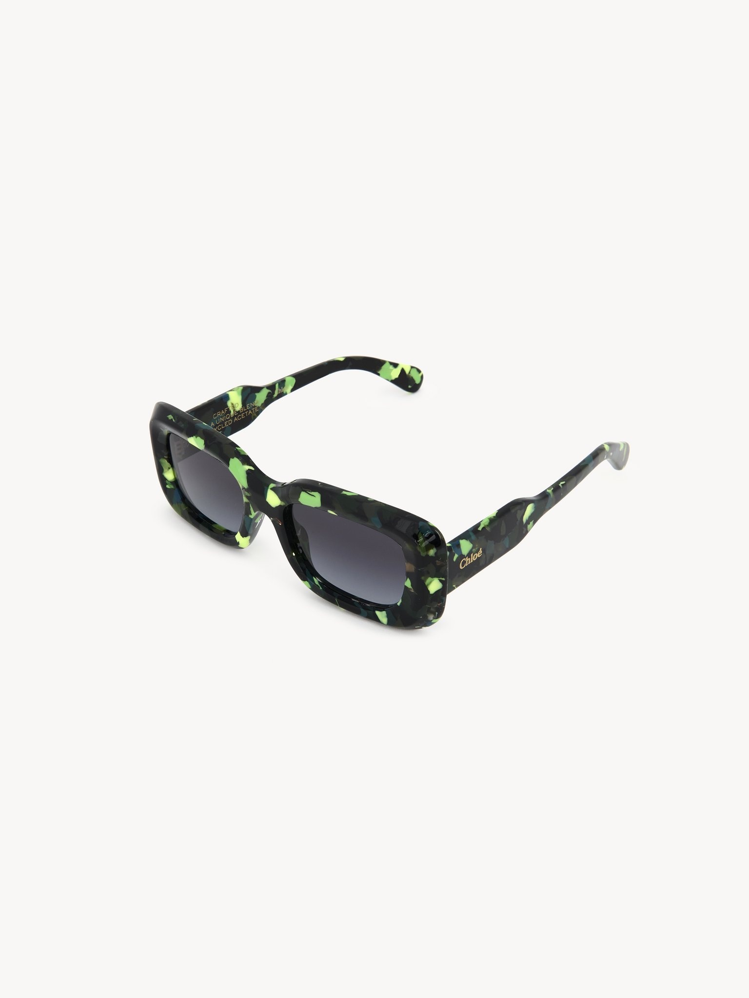 A fashion-forward, lower-impact style made of pre-consumer recycled acetate and bio-based nylon, these Gayia narrow rectangular sunglasses have a shiny frame with round beveled angles and a bold temple shape. Recycled acetate is an innovative material that allows for unique color combinations and limited edition pieces, as numbered inside the temple tips. The frame is paired with gray lenses and a gold-toned Chloe logo engraving on the left temple. An engraved text on the inside of the right temple indicates the style's unique composition. PRODUCT DETAILS Narrow rectangular sunglasses in recycled acetate & bio-based nylon - 100% UVA and UVB protection - Not prescription friendly - Filter category: 3 - Chloe logo engraved on the left temple These sunglasses come with an exclusive case in bonded leather and a lens cloth - Lens: 2" (51 mm) - Bridge: 0.7" (19 mm) - Temple: 5.7" (145 mm) - Spotted Green/Black Havana frame - Gradient gray lenses Item code: CHC23WEK0188314