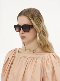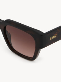 Gayia rectangular sunglasses made of lower-impact pre-consumer recycled acetate and bio-based nylon. The shiny Dark Havana frame is paired with gradient dark wine lenses. An engraved text on the inside of the right temple indicates the style's unique composition. PRODUCT DETAILS Rectangular sunglasses in recycled acetate & bio-based nylon - 100% UVA and UVB protection - Not prescription friendly - Chloe logo engraved on the left temple - Filter category: 2 These sunglasses come with a case and lens cloth - Lens: 2.1" (54 mm) - Bridge: 0.7" (18 mm) - Temple: 5.7" (145 mm) These sunglasses are made with carefully selected materials. Please handle with care for a longer product life. - Store in the case provided. - Clean with a soft, dry cloth. - If necessary, use a damp cloth and mild detergent. Do not use solvents or aggressive detergents which may alter the features of the sunglasses. - Shiny Dark Havana recycled acetate frame - Gradient dark wine lenses Item code: CHC23WEK0190215