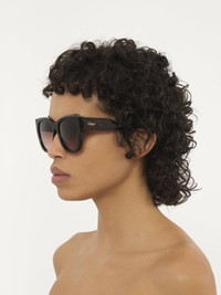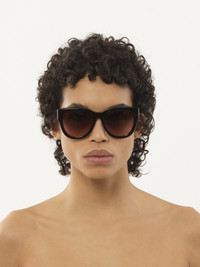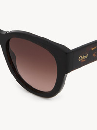 A fashion-forward, lower-impact style made of pre-consumer recycled acetate and bio-based nylon, these Gayia cat-eye sunglasses have a shiny frame with rounded angles and a bold temple shape. Recycled acetate is an innovative material that allows for unique color combinations and limited edition pieces. The frame is paired with double gradient Dark Wine/Nut lenses and a gold-toned Chloé logo engraving on the left temple. An engraved text on the inside of the right temple indicates the style's unique composition. PRODUCT DETAILS Cat-eye sunglasses in recycled acetate & bio-based nylon - 100% UVA and UVB protection - Not prescription friendly - Filter category: 2 - Chloé logo engraved on the left temple These sunglasses come with an exclusive case in bonded leather and a lens cloth - Lens: 2.1" (51 mm) - Bridge: 0.7" (19 mm) - Temple: 5.7" (145 mm) - Dark Havana frame - Double gradient Dark Wine/Nut lenses Item code: CHC23WEK0192215