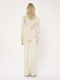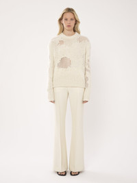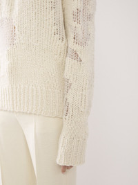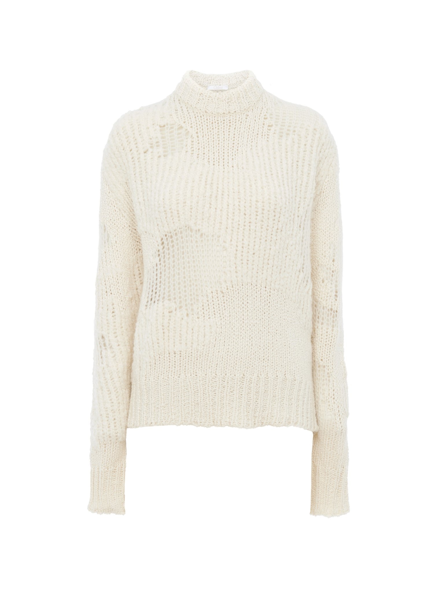 Made from a luxurious wool, cashmere and silk blend, this generous mock-neck sweater features a mesh patch knit that creates a unique play on textures and transparency for a distressed effect. Ribbed trims add a relaxed finish. PRODUCT DETAILS Mock-neck sweater main material: 56% Wool, 34% Cashmere, 7% Silk; 3% Alpaca wool Care: dry cleaning only Fit: generous - The model is 5’10" (179 cm) and wears a prototype in size S - Generous wool sweater - Slips on Color: Iconic Milk Item code: CHC23WMP08540107