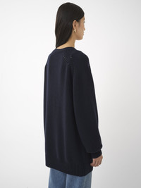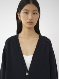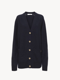 Made from the Maison's iconic recycled cashmere, this V-neck cardigan is a timeless piece elevated with golden-knot buttons through the front. A subtle gold-toned Marcie buckle is hand-applied to the left patch pocket for a signature touch with a hand-stitched finish. The generous silhouette creates a cozy, enveloping allure that balances the jewelry-inspired embellishments. Ribbed trims detail the cuffs, pockets and hem. PRODUCT DETAILS V-neck cardigan main material: 96% Cashmere, 4% Wool Care: dry cleaning only Fit: generous - The model is 5'10" (178 cm) and wears a prototype in size L - Buttoned cardigan - Front patch pockets - Marcie buckle Recycled cashmere keeps its natural softness and insulating power, but with a reduced environmental impact. Using recycled cashmere enables us to extend the lifespan of a fiber that has already been produced. Color: Iconic Navy Item code: CHC24SMC0450148A