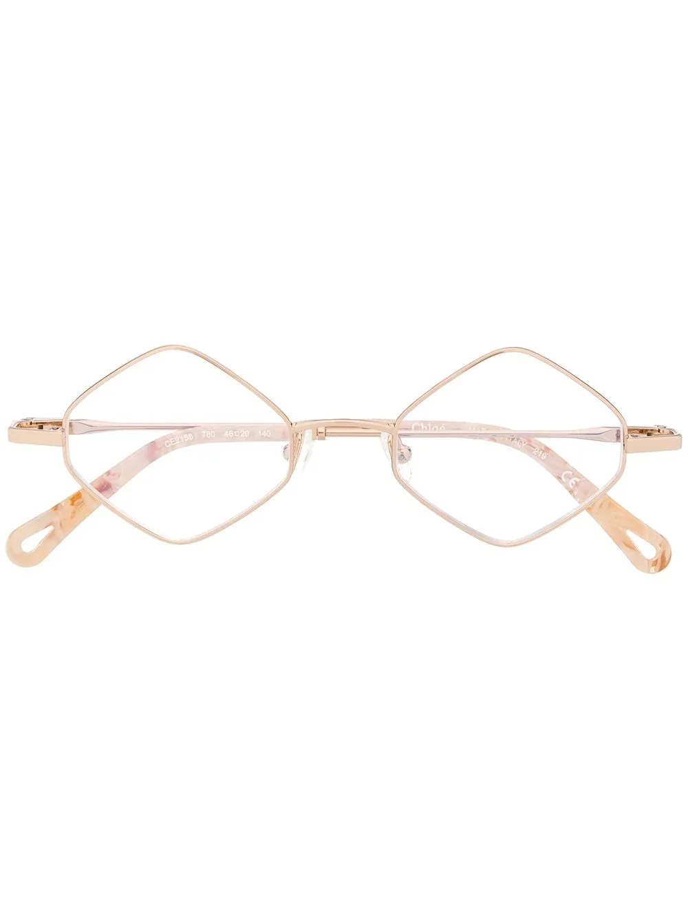 geometric-frame logo glasses Highlights - Gold-tone metal geometric-frame logo glasses from chloe eyewear featuring a brand logo on external arm, straight arms with curved tips and nose pads. this item comes with a protective case. Made in Italy Composition Metal (Other) 100%, Acetate 100% SIZE & FIT Measurement Arm Length 5.51 in(14 cm) Bridge Width 0.78 in(2 cm) Lens Diameter 1.81 in(4.6 cm) Total Width 5.31 in(13.5 cm)
