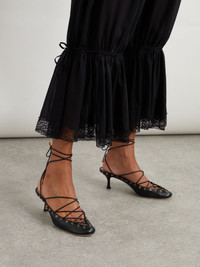 Chloe’s ethereal Summer ’25 collection has us longing for the warm summer months. Worn with multiple looks on the runway, these ‘Ghilies’ pumps are made from smooth leather and have gold-tone eyelets outlining the low V-shaped vamp. They're threaded with slim ties that lace elegantly around the ankle and set on comfortably kitten heels. Details & Care - Black leather (Lamb) - Ties at ankle