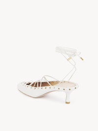 These Chloe Ghillies pumps are crafted from nappa lambskin. Set on a curved kitten heel, they pair an almond toe shape with an open-back silhouette. Corset-inspired lacing and gold-tone hardware finish these light leather pumps. PRODUCT DETAILS Pump heel height: 2.4" (6 cm) Heel-to-toe drop: 2.2" (5.5 cm) Upper: nappa lambskin Inner sole: lambskin Main lining: lambskin Sole: nubuck cowhide Fit true to size, European sizing - Lace-up To make this product, Chloe worked with Leather Working Group (LWG) certified leather manufacturers. LWG certifies tanneries based on their water and energy usage, management of chemicals, solid waste, and wastewater. Color: White Item code: CHC25U10DRI101