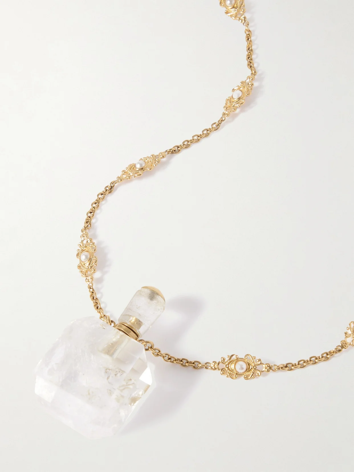 Chloe's Winter '25 collection blends Parisian romance with the house's bohemian spirit. This gold-tone necklace is anchored by a crystal and resin pendant that's shaped like an antique perfume bottle. A closer look reveals lustrous faux pearls dotted along the long chain.