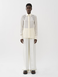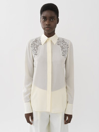 Chloé's iconic crêpe de chine is woven from organically produced silk in this guipure-detail blouse. The delicate star-inspired inserts adorn the shoulders and the back of the neck, instilling the classic silhouette with romantic detail. Concealed mother-of-pearl buttons run through the front. This product was made in collaboration with Akanjo, a certified WFTO supplier. Akanjo is a social enterprise located in Madagascar that places equal pay and employees' health & wellbeing at the core of their priorities. A long-standing partner of Chloé for 15 years, Akanjo is also committed to training and promoting craftsmanship. PRODUCT DETAILS Guipure-detail blouse main material: 100% Silk Buttons: Mother-of-pearl Care: dry cleaning only Fit: classic, long sleeves - The model is 5'10'' (178 cm) and wears a prototype in size 36 - Silk blouse - Concealed mother-of-pearl buttons through front Organic silk manufacturing restricts the use of pesticides, insecticides or harsh chemicals and incorporates methods that respect biodiversity, improve soil quality and reduce water consumption. Color: Coconut Milk Item code: CHC23SHT18004103