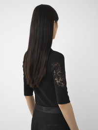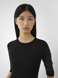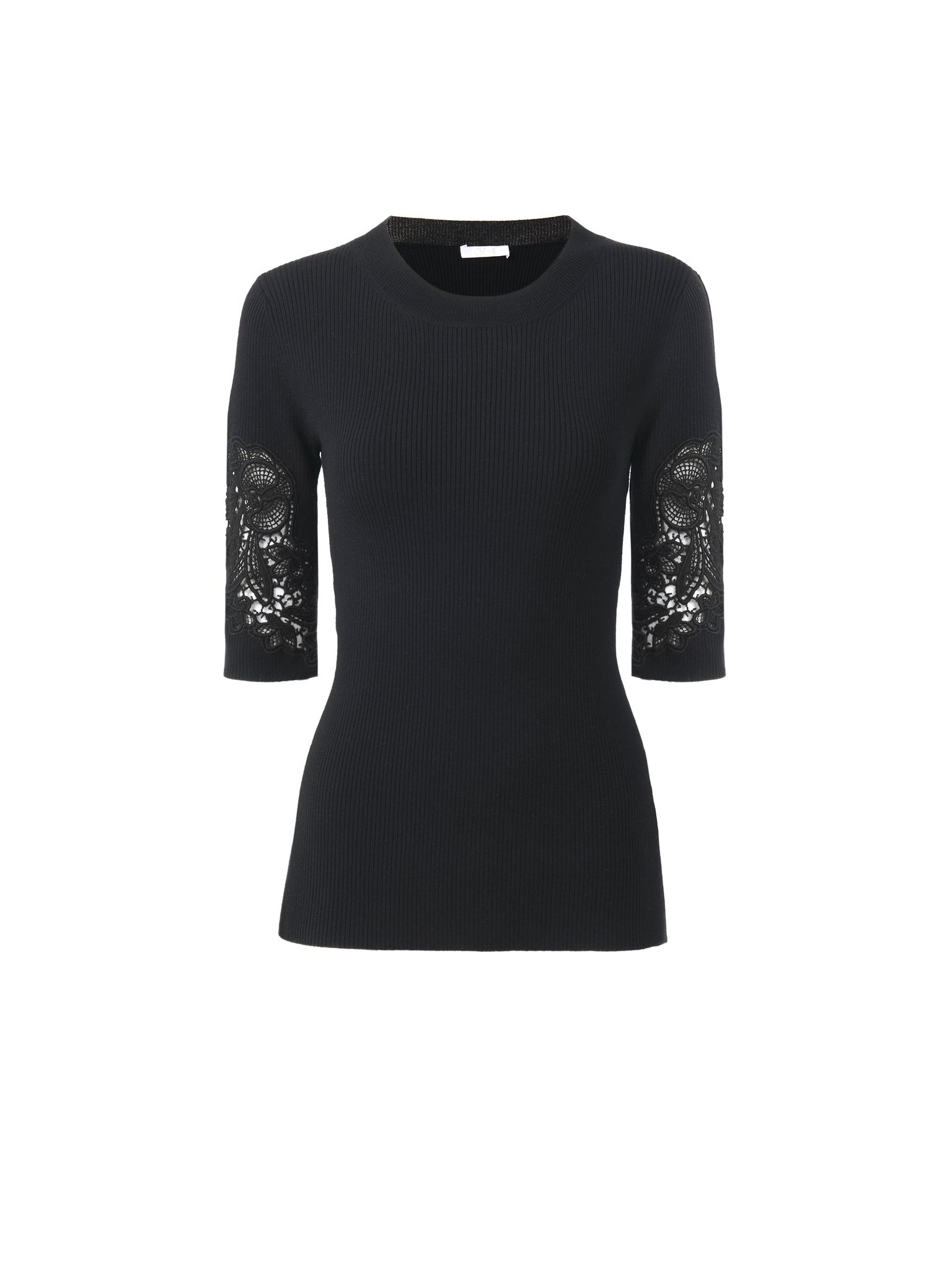 Made from a lower-impact compact wool rib knit, this fitted top is embellished with guipure inserts at the three-quarter sleeves. This romantic, feminine detail is achieved by complex engineering, attesting to the Maison's innovative craftsmanship. PRODUCT DETAILS Fitted top main material: 89% Wool, 9% Polyamide, 2% Elastane Lacework: 48% Acrylic, 42% Wool, 10% Polyester Care: dry cleaning only Fit: fitted - The model is 5'10" (178 cm) and wears a prototype in size S - Guipure top - Slips on The wool used in this product comes from a farm that respects animal welfare, maintains soil health, protects biodiversity and promotes native species. Color: Black Item code: CHC24SMP33550001