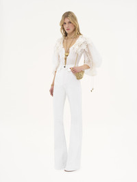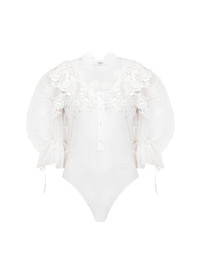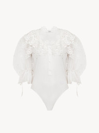 Fitted bodysuit in a guipure lace organic cotton mix, featuring sheer puff sleeves and a guipure trim rooted in the Maison's heritage. Mother-of-pearl buttons and dangling ties with gold-tone charms finish this piece. PRODUCT DETAILS Bodysuit outer shell: 100% Cotton Lining: 100% Cotton Sleeve embroidery: 100% Polyester Embellishment: 100% Polyester Braid: 90% Cotton, 10% Polyamide Sleeves: 100% Polyamide Buttons: 100% Mother-of-pearl Fit: fitted - The model is 5'10" (178 cm) and wears a prototype in size 36 - Guipure-trimmed bodysuit - Mother-of-pearl buttons at front - Snap fastenings at base - Ties with gold-tone charms Care: dry cleaning only An organic cotton farming system sustains the health of soils, ecosystems and people by eliminating the use of toxic and persistent organic pollutants and increasing water conservation. Color: Iconic Milk Item code: CH25UBD05098107