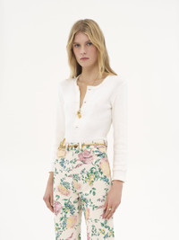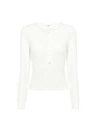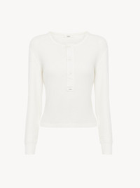 Henley shirt in flatlock ribbed cotton jersey with mother-of-pearl buttons, tonal Chloe logo embroidery at the back of the neck, and a Chloe logo patch at the base of the button placket. PRODUCT DETAILS Henley shirt outer shell: 100% Cotton Buttons: 100% Mother-of-pearl Fit: straight - The model is 5'10" (178 cm) and wears a prototype in size S - Long-sleeve top - Mother-of-pearl buttons at front Care: gentle wash 90°F (30°C) Color: Iconic Milk Item code: CH25UJH14180107