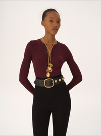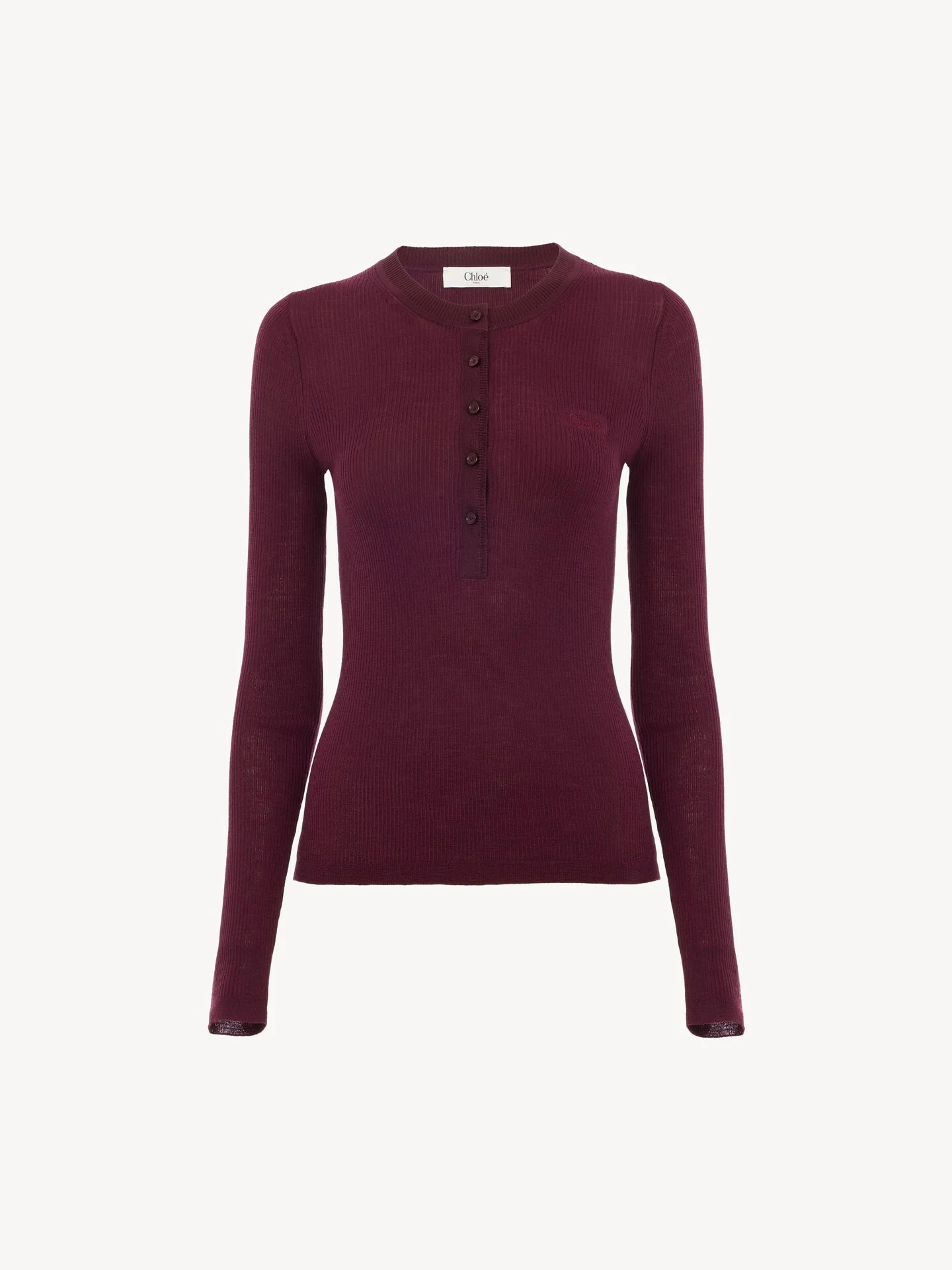DESCRIPTION Henley shirt in a lower-impact superfine wool ribbed knit, featuring a Tunisian collar and mother-of-pearl buttons. Chloe logo embroidery signs the chest. PRODUCT DETAILS Henley shirt outer shell: 100% Wool Buttons: 100% Mother-of-pearl Fit: fitted - The model is 5'10" (178 cm) and wears a prototype in size S - Long-sleeve top - Mother-of-pearl buttons The wool used in this product comes from a farm that respects animal welfare, maintains soil health, protects biodiversity and promotes native species. Color: Burgundy Item code: CH24WMP51667601 CARE INSTRUCTIONS To preserve the integrity of your garment wash it at a maximum of 30°C, using a mild process to protect its delicate nature. This garment cannot withstand any bleaching agent. To maintain its shape, gently iron this garment at a maximum sole plate temperature of 110°C, taking care to avoid any harsh pressure while ironing. Entrust this garment to a specialist for mild cleaning with tetrachloroethylene and solvent F, ensuring its delicate nature is maintained with the most care. To best preserve its form and texture, please do not tumble dry this garment. To maintain its delicate nature, do not wet clean this garment.
