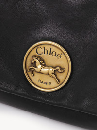 Crafted from grained buffalo leather, this Chloe Heritage shoulder bag is inspired by the Maison's codes. The supple, curved construction is embellished with gold-tone hardware, combining a signature Horse Medal closure with dangling charms. Carry on the shoulder or crossbody with the adjustable chain strap. PRODUCT DETAILS Chloe Heritage shoulder bag in grained buffalo leather Main material: Buffalo leather Main lining: Calfskin Flap lining: Buffalo leather Carry: Shoulder & crossbody - 1 roomy main compartment - 1 inside flat card pocket - 1 front slip pocket - 1 adjustable chain with chain stopper - Magnet clasp closure with notch Comes with a dust bag - Width: 10.2" (26 cm) - Height: 6.1" (15.5 cm) - Depth: 2" (5 cm) - Max. strap drop: 20.5" (52 cm) To make this product, Chloe worked with Leather Working Group (LWG) certified leather manufacturers. LWG certifies tanneries based on their water and energy usage, management of chemicals, solid waste, and wastewater. Color: Black Item code: CH25AS584P75001
