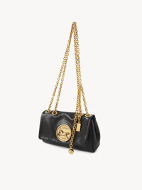 Crafted from grained buffalo leather, this small Chloe Heritage shoulder bag is inspired by the Maison's codes. The supple, curved construction is embellished with gold-tone hardware, combining a signature Horse Medal closure with dangling charms. Carry in the hand, on the shoulder or crossbody with the chain strap. PRODUCT DETAILS Small Chloe Heritage shoulder bag in grained buffalo leather Main material: Buffalo leather Main lining: Calfskin Flap lining: Buffalo leather Carry: Hand, shoulder & crossbody - 1 main compartment - 1 inside flat card pocket - 1 front slip pocket - 1 adjustable chain with chain stopper - Magnet clasp closure with notch Comes with a dust bag - Width: 8.3" (21 cm) - Height: 5.1" (13 cm) - Depth: 2" (5 cm) - Max. strap drop: 20.5" (52 cm) To make this product, Chloe worked with Leather Working Group (LWG) certified leather manufacturers. LWG certifies tanneries based on their water and energy usage, management of chemicals, solid waste, and wastewater. Color: Black Item code: CH25AS585P75001