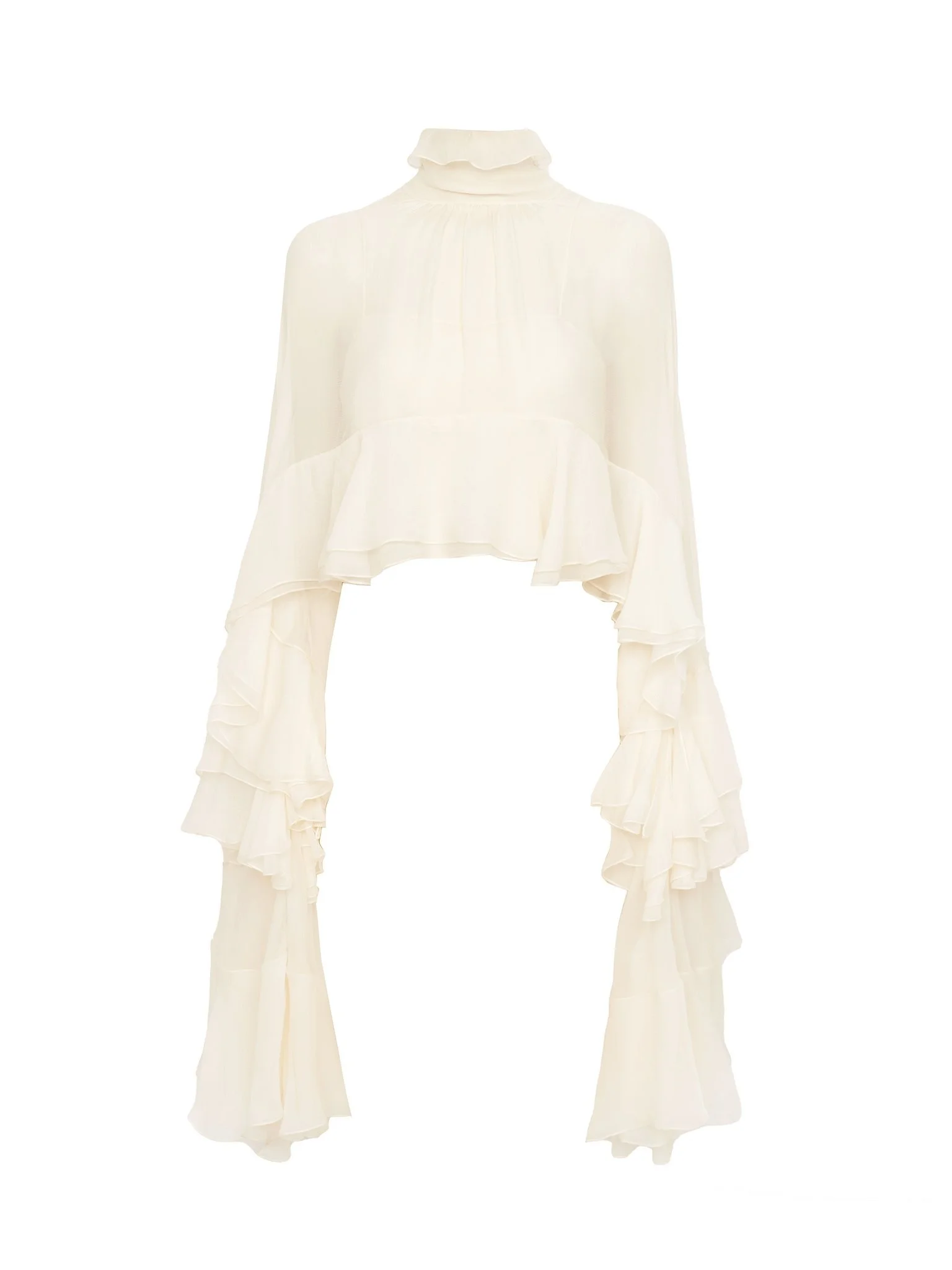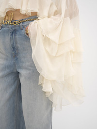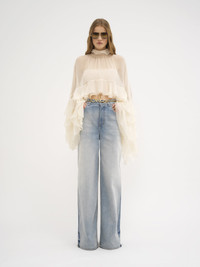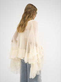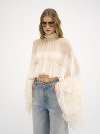 High-low ruffle top in organic silk mousseline with separate lining, featuring a high neck, maxi sleeves and a lavalliere tie fastened at the back. PRODUCT DETAILS High-low ruffle top outer shell: 100% Silk Separate lining: 100% Silk Buttons: 100% Mother-of-pearl Fit: fluid - The model is 5’10” (178 cm) and wears a prototype in size 36 - High-neck silk top - Removable bralette - Lavalliere tie fastened at the back - Mother-of-pearl buttons Care: dry cleaning only Organic silk manufacturing restricts the use of pesticides, insecticides or harsh chemicals and incorporates methods that respect biodiversity, improve soil quality and reduce water consumption. This product was made in collaboration with Akanjo, a certified WFTO supplier. Akanjo is a social enterprise located in Madagascar that places equal pay and employees' health & wellbeing at the core of their priorities. A long-standing partner of Chloe for 15 years, Akanjo is also committed to training and promoting craftsmanship. Color: Whisper White Item code: CH24WHT98116113