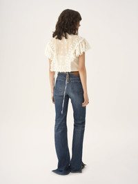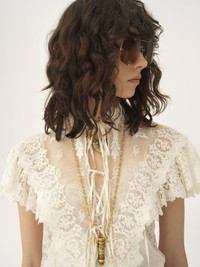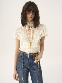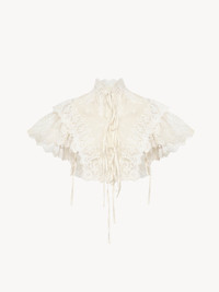 High-neck cropped top in cotton tulle, featuring lace trims and satin ribbons tied at the front. PRODUCT DETAILS Cropped top outer shell: 56% Cotton, 44% Polyamide Embroidery thread: 100% Polyester Fit: cropped - The model is 5'10" (178 cm) and wears a prototype in size 36 - White lace top - Front ribbon fastening This product was made in collaboration with Akanjo, a certified WFTO supplier. Akanjo is a social enterprise located in Madagascar that places equal pay and employees' health & wellbeing at the core of their priorities. A long-standing partner of Chloe for 15 years, Akanjo is also committed to training and promoting craftsmanship. Color: Pristine White Item code: CH25WHT12401114