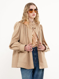High-neck gathered jacket in light organic cotton gabardine, featuring gathered shoulders, engraved horn buttons and patch pockets. PRODUCT DETAILS Gathered jacket outer shell: 100% Cotton Buttons: 100% Horn Fit: straight - The model is 5'10" (178 cm) and wears a prototype in size 36 - Gathered cotton jacket - Engraved horn buttons through front & at cuffs - 2 front patch pockets - Gold metal Chloe logo triangle at left pocket Care: dry cleaning only An organic cotton farming system sustains the health of soils, ecosystems and people by eliminating the use of toxic and persistent organic pollutants and increasing water conservation. Color: Soft Tan Item code: CH25UVE20118275