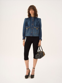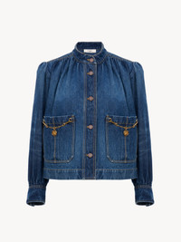 DESCRIPTION High-neck gathered jacket in indigo wash organic cotton denim, featuring puff sleeves, patch pockets detailed with gold brass Horse Medal chains, and Chloe-engraved jean buttons. PRODUCT DETAILS Gathered jacket outer shell: 100% Cotton Fit: straight - The model is 5'10" (178 cm) and wears a prototype in size 36 - Denim jacket - Chloe-engraved jean buttons through front & at cuffs - 2 front patch pockets An organic cotton farming system sustains the health of soils, ecosystems and people by eliminating the use of toxic and persistent organic pollutants and increasing water conservation. Color: Faded Indigo Item code: CH26SDV092584A1 CARE INSTRUCTIONS To preserve the integrity of your garment wash it at a maximum of 30°C, using a mild process to protect its delicate nature. This garment cannot withstand any bleaching agent. To maintain its shape, gently iron this garment at a maximum sole plate temperature of 110°C, taking care to avoid any harsh pressure while ironing. Entrust this garment to a specialist for mild cleaning with tetrachloroethylene and solvent F, ensuring its delicate nature is maintained with the most care. To best preserve its form and texture, please do not tumble dry this garment. To maintain its delicate nature, do not wet clean this garment. TRACEABILITY Better traceability is central to improving our materials as well as social and environmental practices. Dyeing: Italy Weaving: Italy