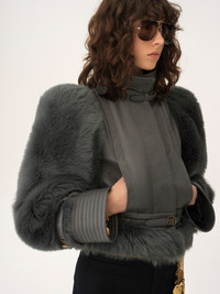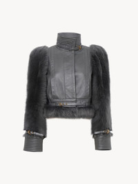 DESCRIPTION High-neck hybrid jacket in Vernicetta lambskin and shearling, featuring puff sleeves, engraved horn buttons and fine, buckled belts. PRODUCT DETAILS Hybrid jacket outer shell: 100% Lambskin Secondary material: 100% Lambskin Lining: 100% Cupro Buttons: 100% Water buffalo horn Fit: straight - The model is 5'10" (178 cm) and wears a prototype in size 36 - Leather fur jacket - Concealed engraved horn buttons through front - Side pockets - Buckled belts at neck, waist & cuffs To make this product, Chloe worked with Leather Working Group (LWG) certified leather manufacturers. LWG certifies tanneries based on their water and energy usage, management of chemicals, solid waste, and wastewater. Color: Burnt Grey Item code: CH25WCV68924028 CARE INSTRUCTIONS To preserve the integrity of your garment, please refrain from washing, entrusting its care to professional cleaning services for optimal maintenance. This garment cannot withstand any bleaching agent. To maintain its shape, refrain from ironing this garment. To best preserve its texture and form, do not dry clean this garment. To maintain its delicate nature, do not wet clean this garment. To best preserve its form and texture, please do not tumble dry this garment. TRACEABILITY Better traceability is central to improving our materials as well as social and environmental practices. Finishing: Italy