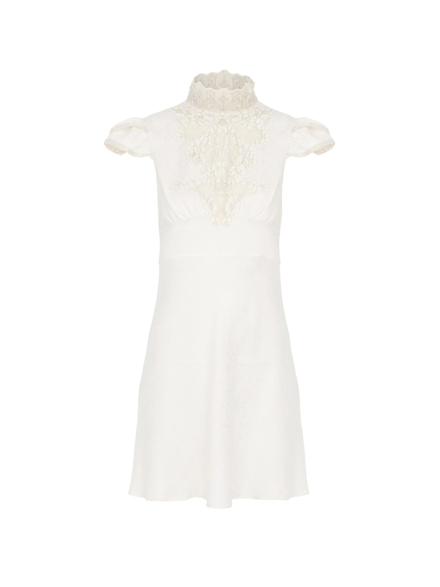 High-neck mini dress in mini floral jacquard organic silk with lace inserts, featuring cap sleeves, fabric-covered buttons and a ribbon tie. PRODUCT DETAILS Mini dress outer shell: 100% Silk Secondary material: 56% Cotton, 44% Polyamide Embroidery thread: 100% Polyester Fit: fluid, mini length - The model is 5'10" (178 cm) and wears a prototype in size 34 - Mini white dress - Fabric-covered buttons at back Organic silk manufacturing restricts the use of pesticides, insecticides or harsh chemicals and incorporates methods that respect biodiversity, improve soil quality and reduce water consumption. This product was made in collaboration with Akanjo, a certified WFTO supplier. Akanjo is a social enterprise located in Madagascar that places equal pay and employees' health & wellbeing at the core of their priorities. A long-standing partner of Chloe for 15 years, Akanjo is also committed to training and promoting craftsmanship. Color: Iconic Milk Item code: CH25WRO52332107