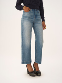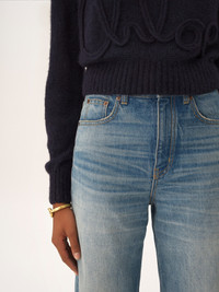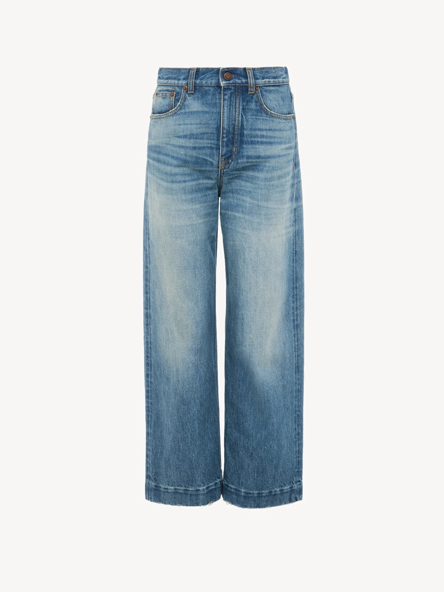 DESCRIPTION High-rise, wide-leg cropped jeans in indigo wash organic cotton denim. PRODUCT DETAILS High-rise cropped jeans outer shell: 100% Cotton Patch: 100% Calfskin Fit: high-rise, wide-leg, cropped - The model is 5'10" (178 cm) and wears a prototype in size 26 - Chloe jeans - Front zipper & Chloe-engraved button fastening - Classic 5-pocket design - Belt loops - Leather Chloe patch at back An organic cotton farming system sustains the health of soils, ecosystems and people by eliminating the use of toxic and persistent organic pollutants and increasing water conservation. Color: Dream Blue Item code: CH26SDP4325240R CARE INSTRUCTIONS To preserve the integrity of your garment wash it at a maximum of 30°C, using a mild process to protect its delicate nature. This garment cannot withstand any bleaching agent. To maintain its shape, gently iron this garment at a maximum sole plate temperature of 110°C, taking care to avoid any harsh pressure while ironing. Entrust this garment to a specialist for mild cleaning with tetrachloroethylene and solvent F, ensuring its delicate nature is maintained with the most care. To best preserve its form and texture, please do not tumble dry this garment. To maintain its delicate nature, do not wet clean this garment. TRACEABILITY Better traceability is central to improving our materials as well as social and environmental practices. Dyeing: Italy Finishing: Italy Weaving: Italy