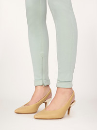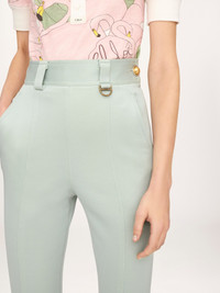 DESCRIPTION High-rise fitted pants in bonded stretch jersey, detailed with front seams, a gold-tone cabochon button at the side and a gold-tone D-ring at the front. PRODUCT DETAILS Fitted pants outer shell: 83% Viscose, 14% Polyamide, 3% Elastane Pocket lining: 76% Acetate fiber, 24% Silk Fit: fitted - The model is 5'10" (178 cm) and wears a prototype in size 36 - High-waisted pants - Side zipper & gold-tone button fastening - Horn internal button - Belt loops Color: Misty Blue Item code: CH26UPA0898741X CARE INSTRUCTIONS To preserve the integrity of your garment, please refrain from washing, entrusting its care to professional cleaning services for optimal maintenance. This garment cannot withstand any bleaching agent. To maintain its shape, gently iron this garment at a maximum sole plate temperature of 110°C, taking care to avoid any harsh pressure while ironing. Entrust this garment to a specialist for mild cleaning with tetrachloroethylene and solvent F, ensuring its delicate nature is maintained with the most care. To best preserve its form and texture, please do not tumble dry this garment. To maintain its delicate nature, do not wet clean this garment.