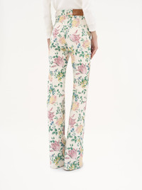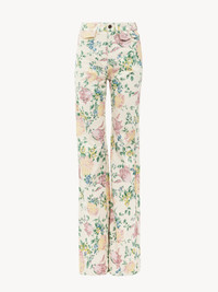 High-rise flare jeans in all-over floral printed organic cotton denim with a painted effect inspired by the Maison's heritage. Mini flap pockets detail the waist. PRODUCT DETAILS High-rise flare jeans outer shell: 100% Cotton Patch: 100% Calfskin Fit: flared, high waist - The model is 5'10" (178 cm) and wears a prototype in size 36 - High-rise jeans - Front zipper & Chloe-engraved button fastening - 3 mini flap pockets at waist - Back pockets - Belt loops - Leather Chloe patch at back Care: gentle wash 90°F (30°C) An organic cotton farming system sustains the health of soils, ecosystems and people by eliminating the use of toxic and persistent organic pollutants and increasing water conservation. Color: Grizzled Blue Item code: CH25UDP03256468