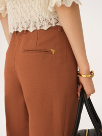 DESCRIPTION High-rise flared tailored pants in organic cotton canvas, featuring a gold-tone Horse Medal button and a Chloe logo triangle at the back. PRODUCT DETAILS High-rise flared pants outer shell: 100% Cotton Fit: flared - The model is 5'10" (178 cm) and wears a prototype in size 36 - High-waisted pants - Horse Medal button - Front zipper - Piped front & back pockets - Belt loops An organic cotton farming system sustains the health of soils, ecosystems and people by eliminating the use of toxic and persistent organic pollutants and increasing water conservation. Color: Nougat Item code: CH26SPA7604126S CARE INSTRUCTIONS To preserve the integrity of your garment, please refrain from washing, entrusting its care to professional cleaning services for optimal maintenance. This garment cannot withstand any bleaching agent. To maintain its shape, gently iron this garment at a maximum sole plate temperature of 110°C, taking care to avoid any harsh pressure while ironing. Entrust this garment to a specialist for mild cleaning with tetrachloroethylene and solvent F, ensuring its delicate nature is maintained with the most care. To best preserve its form and texture, please do not tumble dry this garment. To maintain its delicate nature, do not wet clean this garment. TRACEABILITY Better traceability is central to improving our materials as well as social and environmental practices. Dyeing: Italy Finishing: Italy Weaving: Italy