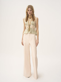 High-rise flared pants in lower-impact light wool gabardine, detailed with a mini flap pocket at the hip. PRODUCT DETAILS High-rise flared pants outer shell: 100% Wool Lining: 100% Silk Buttons: 100% Water buffalo horn Fit: flared - The model is 5'10" (178 cm) and wears a prototype in size 36 - High-waisted pants - Front zipper & hook fastening - Engraved horn button - Mini flap pocket at right hip - Piped back pockets - Belt loops The wool used in this product comes from a farm that respects animal welfare, maintains soil health, protects biodiversity and promotes native species. This piece was created in collaboration with Chize Confection. A long-standing partner of Chloe, Chize Confection is a Societe Cooperative de Production (SCOP). This cooperative model is distinguished by its democratic governance, fostering a collaborative and democratic working environment. Chloe has signed a contract to financially support Chize Confection with projects that will benefit its employees. Color: Biscuit Pink Item code: CH25APA060666H7