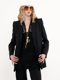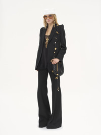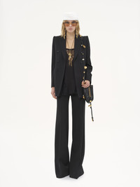 High-rise flared pants in lower-impact wool grain de poudre with pressed front creases. PRODUCT DETAILS High-rise flared pants outer shell: 100% Wool Lining: 100% Silk Buttons: 100% Horn Fit: high-waisted, flared - The model is 5'10" (178 cm) and wears a prototype in size 34 - Tailored wool pants - Front zipper - Engraved horn button - Side pockets - Top-stitched back pockets - Belt loops Care: dry cleaning only The wool used in this product comes from a farm that respects animal welfare, maintains soil health, protects biodiversity and promotes native species. Color: Black Item code: CH25UPA15067001
