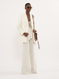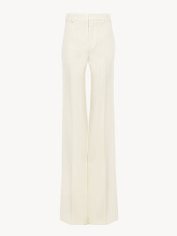 High-rise flared pants in lower-impact wool grain de poudre with pressed front creases. PRODUCT DETAILS High-rise flared pants outer shell: 100% Wool Lining: 100% Silk Buttons: 100% Horn Fit: high-waisted, flared - The model is 5'10" (178 cm) and wears a prototype in size 34 - Tailored wool pants - Front zipper - Engraved horn button - Side pockets - Top-stitched back pockets - Belt loops Care: dry cleaning only The wool used in this product comes from a farm that respects animal welfare, maintains soil health, protects biodiversity and promotes native species. Color: Iconic Milk Item code: CH25UPA15067107