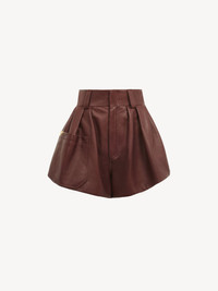 High-rise shorts in plonge nappa leather, featuring a gathered silhouette and a maxi patch pocket at the front. A gold metal Chloe logo triangle finishes these leather shorts. PRODUCT DETAILS Leather shorts outer shell: 100% Lambskin Main lining: 62% Viscose, 38% Cotton Pocket lining: 51% Cotton, 49% Viscose Fit: high waist, fluid - The model is 5'10" (178 cm) and wears a prototype in size 34 - High-waisted leather shorts - Front hook & zipper fastening - Side pockets - Right front patch pocket with gold metal Chloe logo triangle - Right back piped pocket - Belt loops Care: leather specialist only Color: Faded Mahogany Item code: CH25UCS0420527N