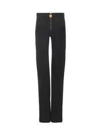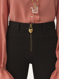 Slim jeans in black denim with a front zipper and a gold-tone heart-lock charm puller, featuring slit hems and a gold-tone D-ring at the back. PRODUCT DETAILS Slim jeans outer shell: 100% Cotton Patch: 100% Calfskin Fit: slim - The model is 5'10" (178 cm) and wears a prototype in size 26 - Chloe jeans - Front zipper with charm puller - Piped front & back pockets - Belt loops - Leather Chloe patch with gold-tone D-ring at back Color: Black Item code: CH25WDP72150001