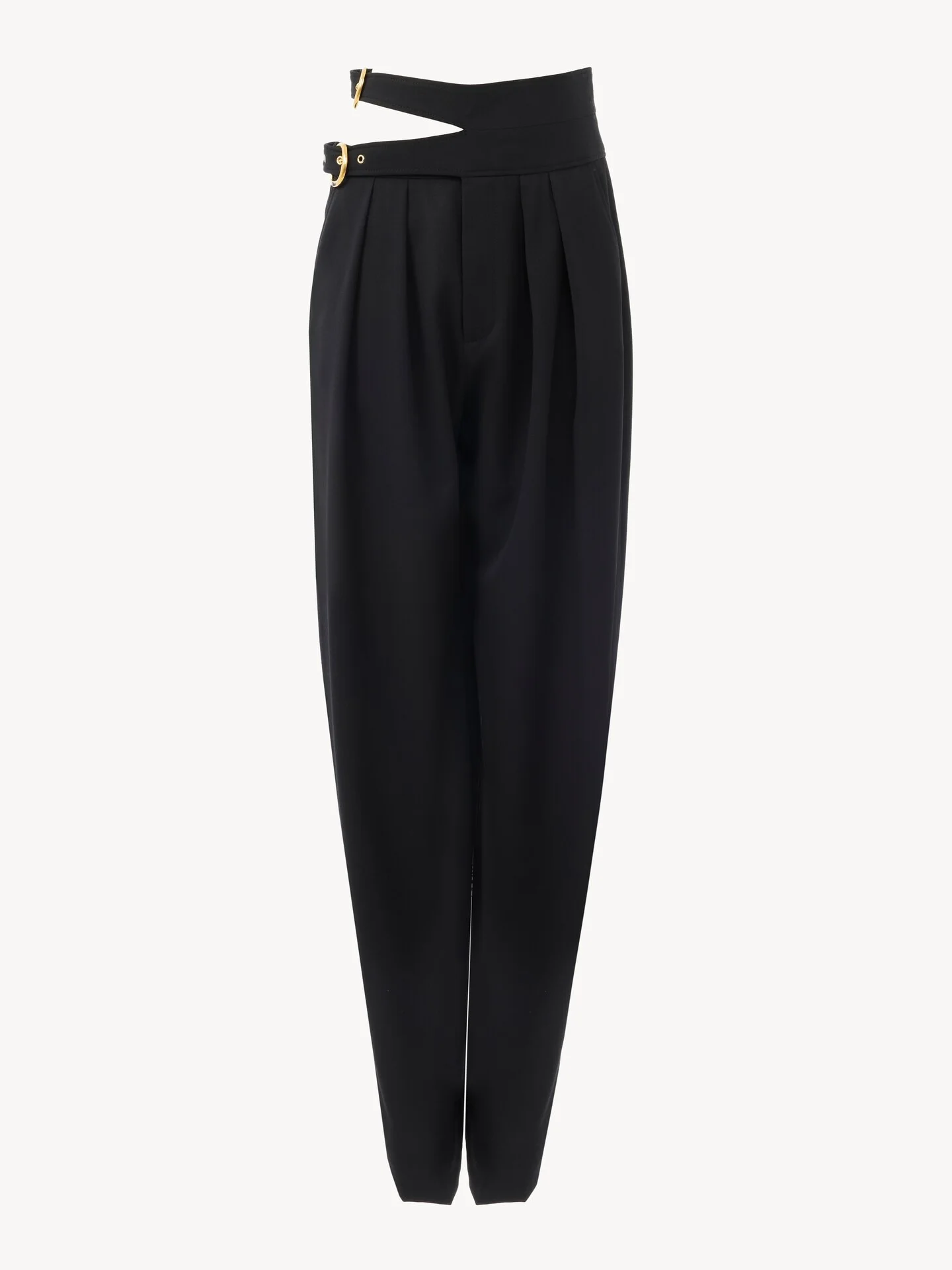 DESCRIPTION High-rise tailored pants in lower-impact wool grain de poudre, gathered at the waist and featuring double belts with gold-tone buckles. PRODUCT DETAILS Tailored pants outer shell: 100% Wool Pocket lining: 100% Cotton Inside button: 100% Water buffalo horn Fit: tailored - The model is 5'10" (178 cm) and wears a prototype in size 36 - High-waisted pants - Front hook & zipper fastening - Engraved horn internal button - Side pockets - Piped back pockets - Double belt with buckles The wool used in this product comes from a farm that respects animal welfare, maintains soil health, protects biodiversity and promotes native species. Color: Black Item code: CH26SPA08067001 CARE INSTRUCTIONS To preserve the integrity of your garment, please refrain from washing, entrusting its care to professional cleaning services for optimal maintenance. This garment cannot withstand any bleaching agent. To maintain its shape, gently iron this garment at a maximum sole plate temperature of 110°C, taking care to avoid any harsh pressure while ironing. Entrust this garment to a specialist for mild cleaning with tetrachloroethylene and solvent F, ensuring its delicate nature is maintained with the most care. To best preserve its form and texture, please do not tumble dry this garment. To maintain its delicate nature, do not wet clean this garment. TRACEABILITY Better traceability is central to improving our materials as well as social and environmental practices. Dyeing: Italy Finishing: Italy Weaving: Italy