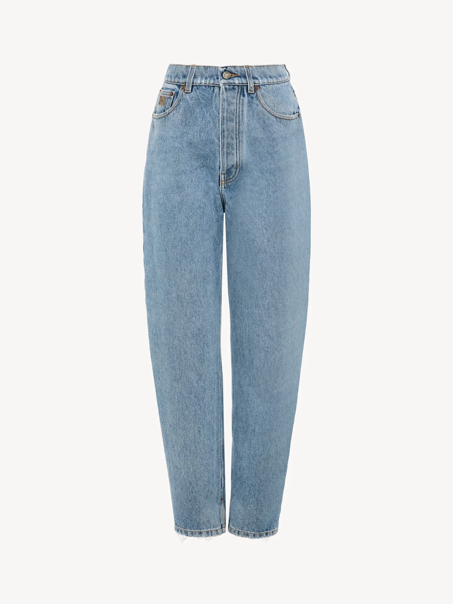 DESCRIPTION High-rise tapered jeans in light indigo wash organic cotton denim with a relaxed fit and a split hem. A Chloe logo plate signs the coin pocket. PRODUCT DETAILS High-rise tapered jeans outer shell: 100% Cotton Patch: 100% Calfskin Fit: high-rise, relaxed - The model is 5'10" (178 cm) and wears a prototype in size 26 - Chloe jeans - Front Chloe-engraved button fastening & hidden button placket - Classic 5-pocket design - Belt loops - Leather Chloe patch at back An organic cotton farming system sustains the health of soils, ecosystems and people by eliminating the use of toxic and persistent organic pollutants and increasing water conservation. Color: Tiger Lily Blue Item code: CH26SDP3015140P CARE INSTRUCTIONS To preserve the integrity of your garment wash it at a maximum of 30°C, using a mild process to protect its delicate nature. This garment cannot withstand any bleaching agent. To maintain its shape, gently iron this garment at a maximum sole plate temperature of 110°C, taking care to avoid any harsh pressure while ironing. Entrust this garment to a specialist for mild cleaning with tetrachloroethylene and solvent F, ensuring its delicate nature is maintained with the most care. To best preserve its form and texture, please do not tumble dry this garment. To maintain its delicate nature, do not wet clean this garment. TRACEABILITY Better traceability is central to improving our materials as well as social and environmental practices. Finishing: Italy Weaving: Italy