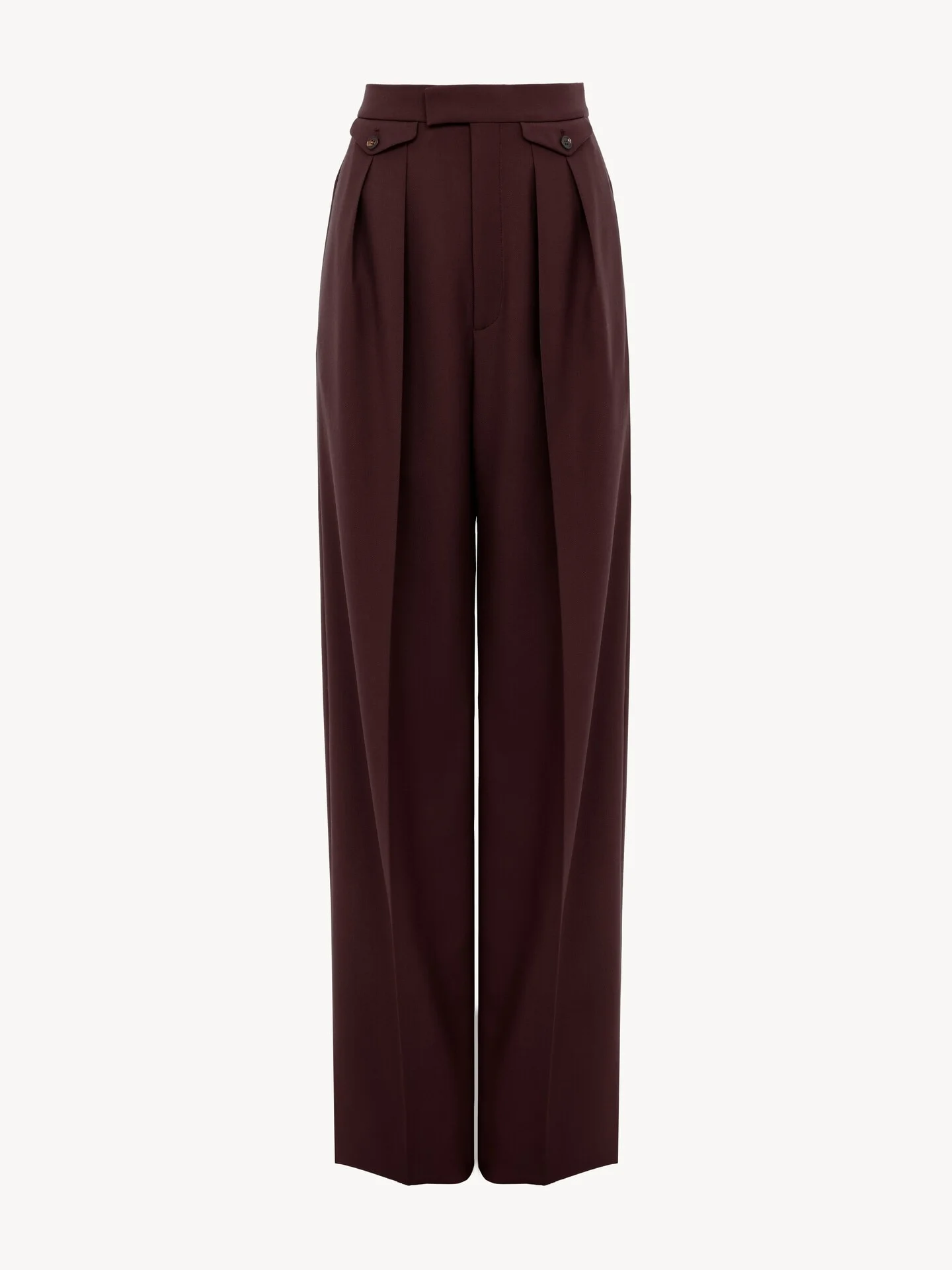 DESCRIPTION High-rise gathered pants in wool gabardine, featuring front and back mini flap pockets finished with engraved horn buttons. PRODUCT DETAILS Gathered pants outer shell: 100% Wool Lining: 100% Cotton Buttons: 100% Water buffalo horn Fit: tailored - The model is 5'10" (178 cm) and wears a prototype in size 36 - High-waisted pants - Front hook & zipper fastening - Engraved horn internal button - Side pockets - Front & back buttoned mini flap pockets Color: Deep Purple Item code: CH26SPA0616456B CARE INSTRUCTIONS To preserve the integrity of your garment, please refrain from washing, entrusting its care to professional cleaning services for optimal maintenance. This garment cannot withstand any bleaching agent. To maintain its shape, gently iron this garment at a maximum sole plate temperature of 110°C, taking care to avoid any harsh pressure while ironing. Entrust this garment to a specialist for mild cleaning with tetrachloroethylene and solvent F, ensuring its delicate nature is maintained with the most care. To best preserve its form and texture, please do not tumble dry this garment. To maintain its delicate nature, do not wet clean this garment. TRACEABILITY Better traceability is central to improving our materials as well as social and environmental practices. Dyeing: Italy Finishing: Italy Weaving: Italy