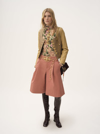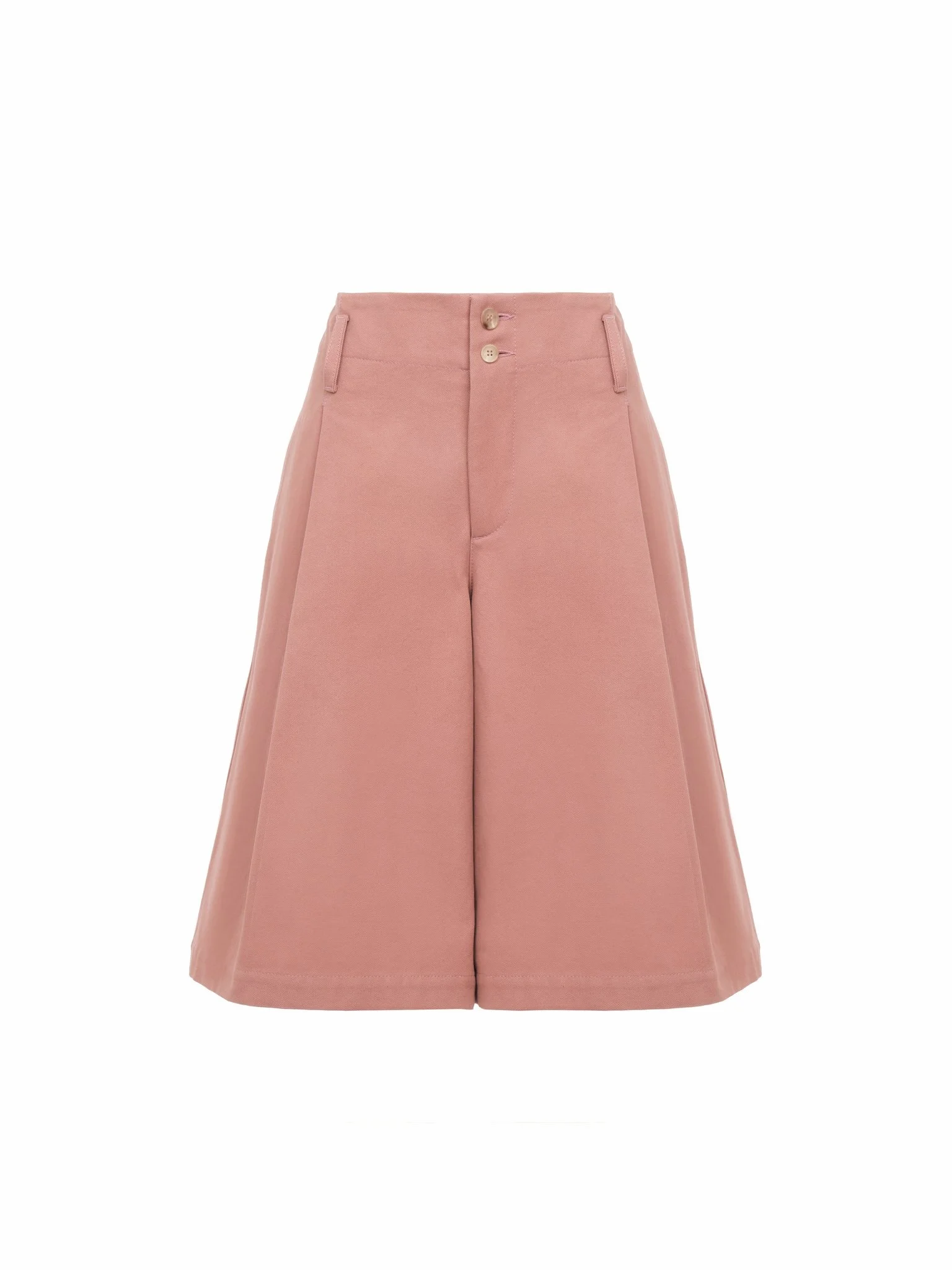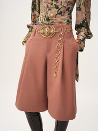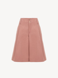 High-rise, wide-leg bermuda shorts in garment-dyed organic cotton canvas, featuring front pleats and engraved horn buttons. PRODUCT DETAILS Bermuda shorts outer shell: 100% Cotton Buttons: 100% Water buffalo horn Fit: high waist, wide leg - The model is 5'10" (178 cm) and wears a prototype in size 36 - Tailored Chloe shorts - Engraved horn buttons at front & back pockets - Front zipper - Side pockets - Piped back pockets - Belt loops An organic cotton farming system sustains the health of soils, ecosystems and people by eliminating the use of toxic and persistent organic pollutants and increasing water conservation. Color: Wild Pink Item code: CH25ASH083656L7