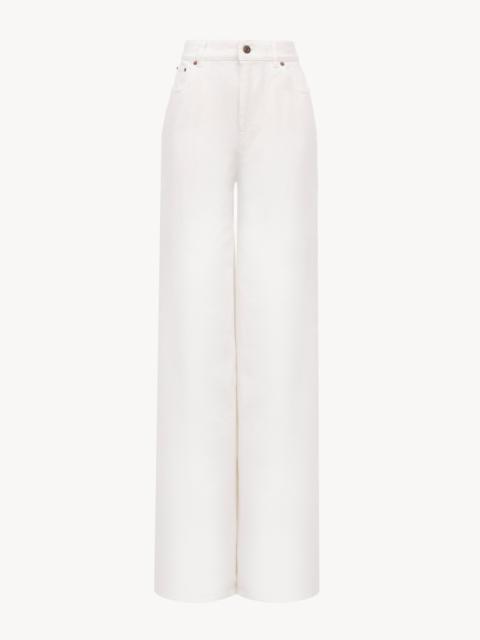 DESCRIPTION High-rise wide-leg jeans in lightweight organic cotton denim. PRODUCT DETAILS Wide-leg jeans outer shell: 100% Cotton Patch: 100% Calfskin Pocket lining: 65% Polyester, 35% Cotton Fit: wide leg, high waist - The model is 5'10" (178 cm) and wears a prototype in size 24 - High-rise jeans - Front zipper & Chloe-engraved button fastening - Classic 5-pocket design - Belt loops - Half-moon leather Chloe patch at back An organic cotton farming system sustains the health of soils, ecosystems and people by eliminating the use of toxic and persistent organic pollutants and increasing water conservation. This piece runs large; we recommend selecting one size smaller than your usual size. Color: White Item code: CH25ADP02257101 CARE INSTRUCTIONS To preserve the integrity of your garment wash it at a maximum of 30°C, using a mild process to protect its delicate nature. This garment cannot withstand any bleaching agent. To maintain its shape, gently iron this garment at a maximum sole plate temperature of 110°C, taking care to avoid any harsh pressure while ironing. Entrust this garment to a specialist for mild cleaning with tetrachloroethylene and solvent F, ensuring its delicate nature is maintained with the most care. To maintain its delicate nature, do not wet clean this garment. To best preserve its form and texture, please do not tumble dry this garment.
